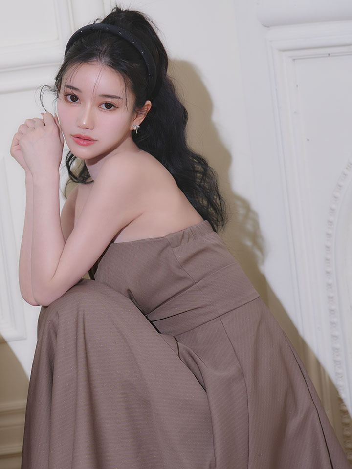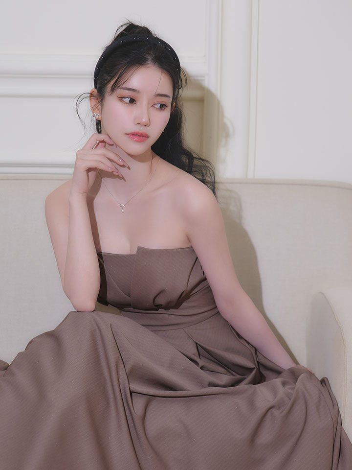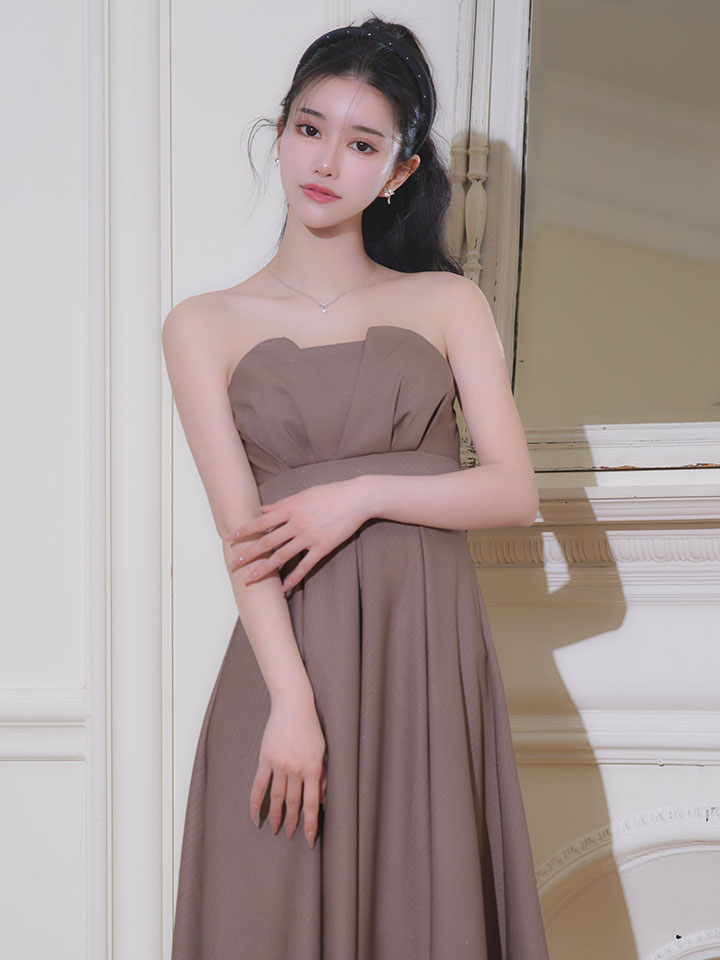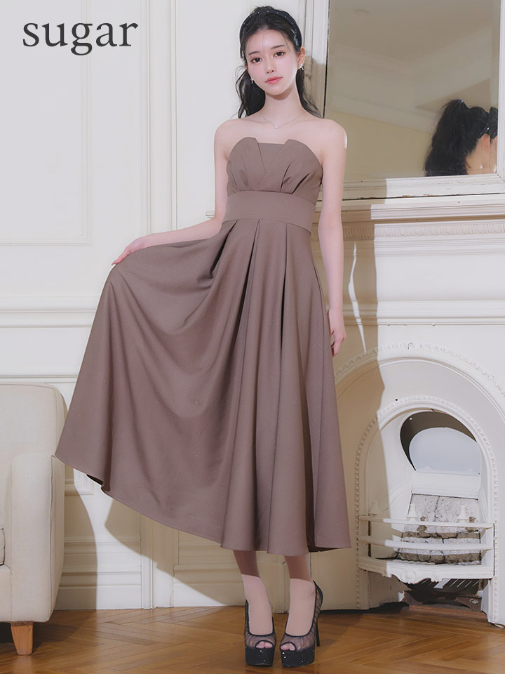 XSサイズあり【Veautt/ヴュート】【OF05】べアトップ/ バストタック/ ウエストマーク/ プリーツ/ フレア/ ワンピース/ ロングドレス/ キャバドレス [VT082602-GY-S260131]