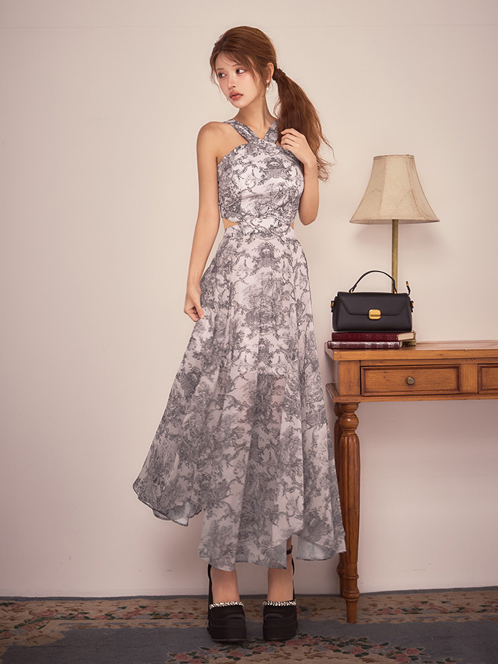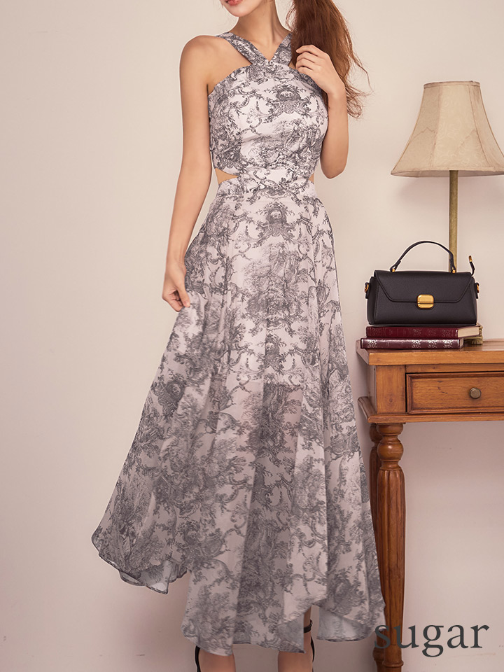 XSサイズあり【ANDY/アンディ】ホルターネック/ クラシカルプリント/ ウエストカット/ シフォン/ フレア/ マキシ丈/ ワンピース/ ロングドレス/ キャバドレスlong[OF05]