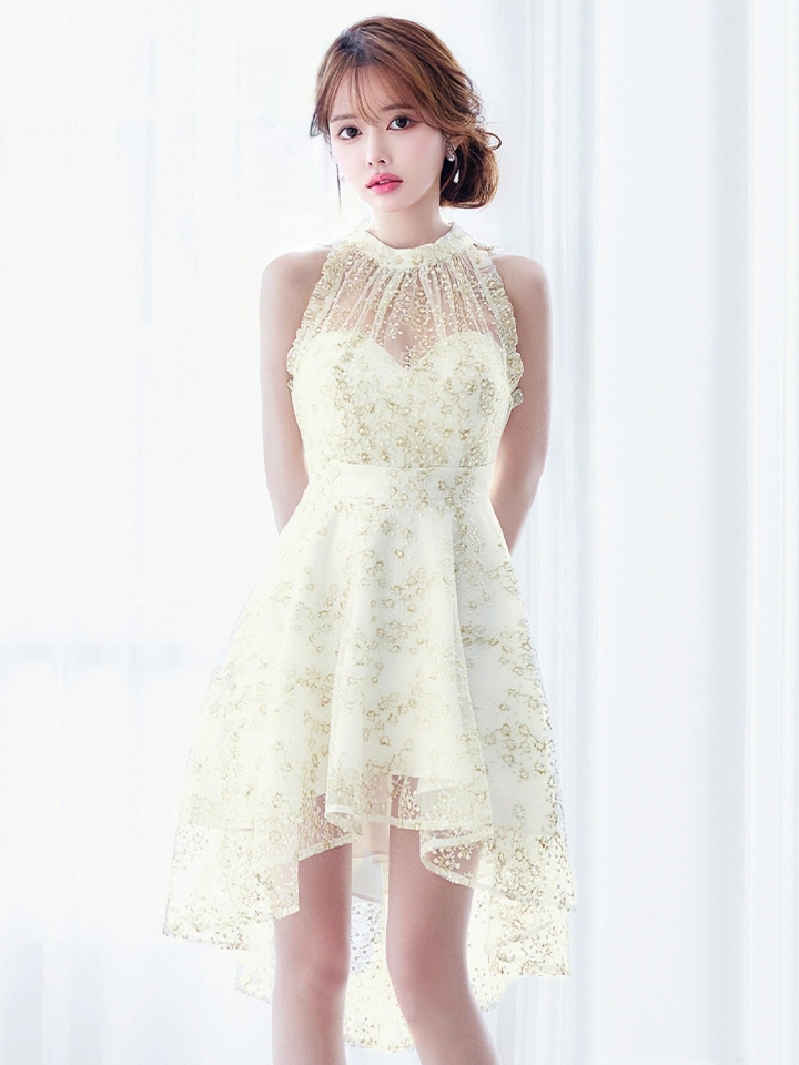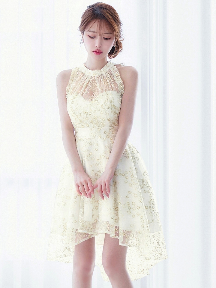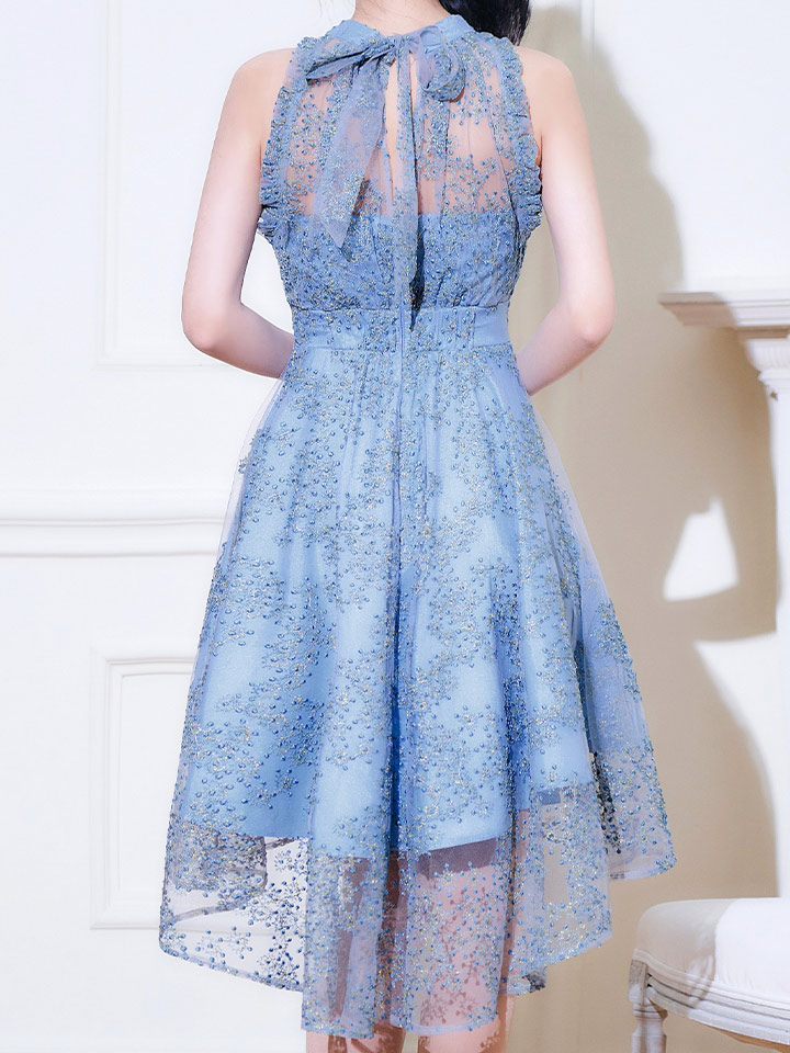 繊細な刺繍とシアーな透け感が女度を上げるフレアミニドレス。