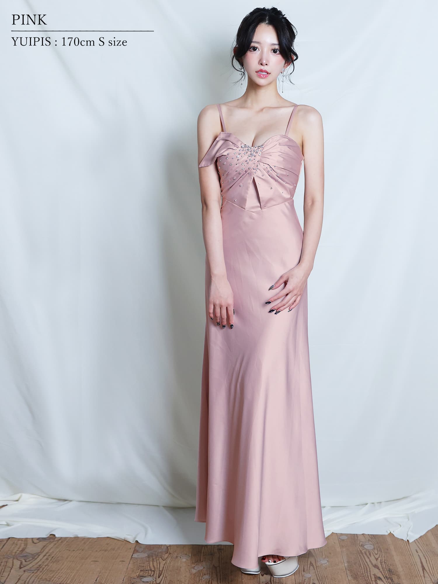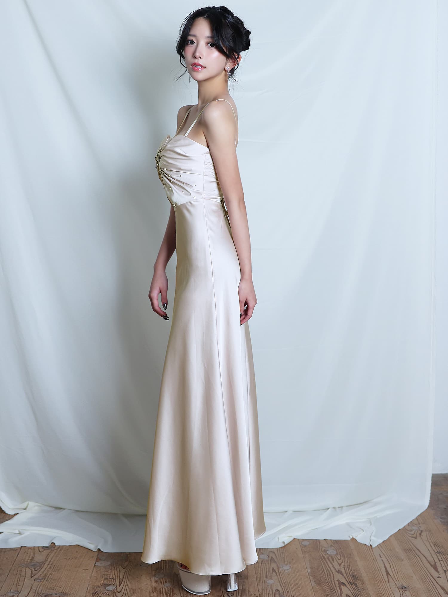 胸元に立体的なドレープとビジュー装飾を施し、上品な華やかさを演出するデザイン。