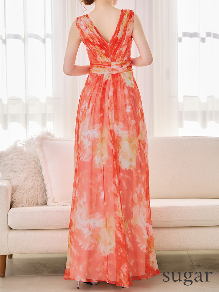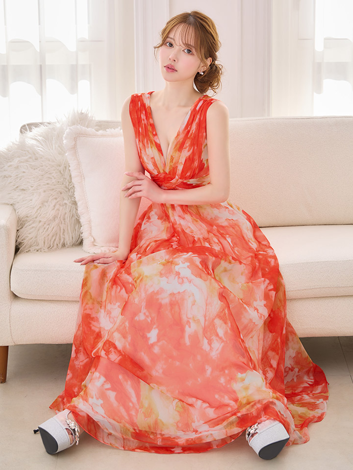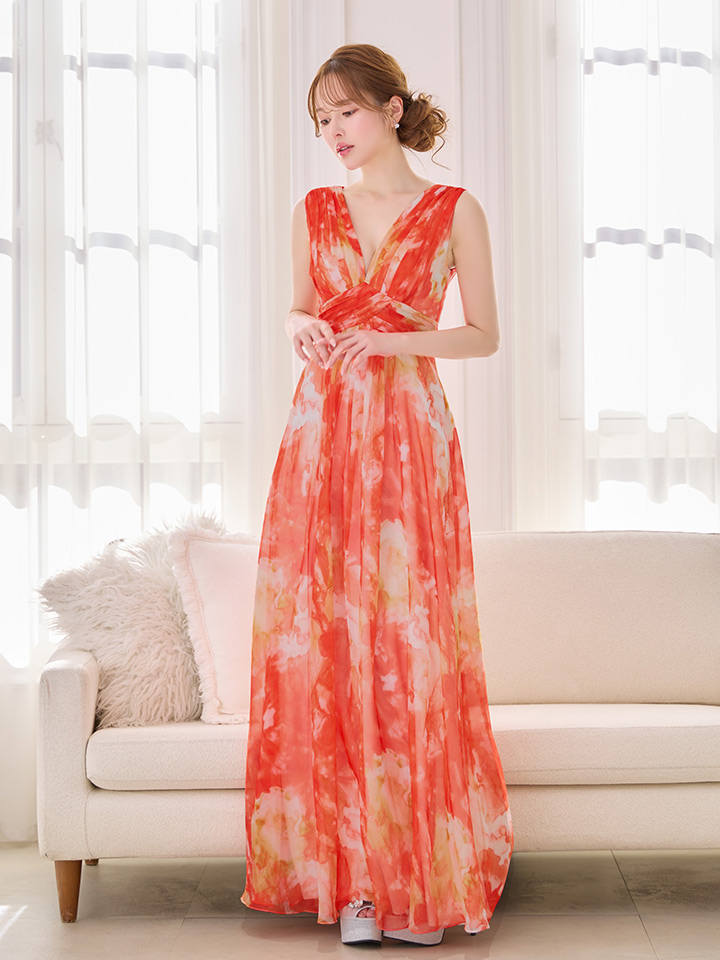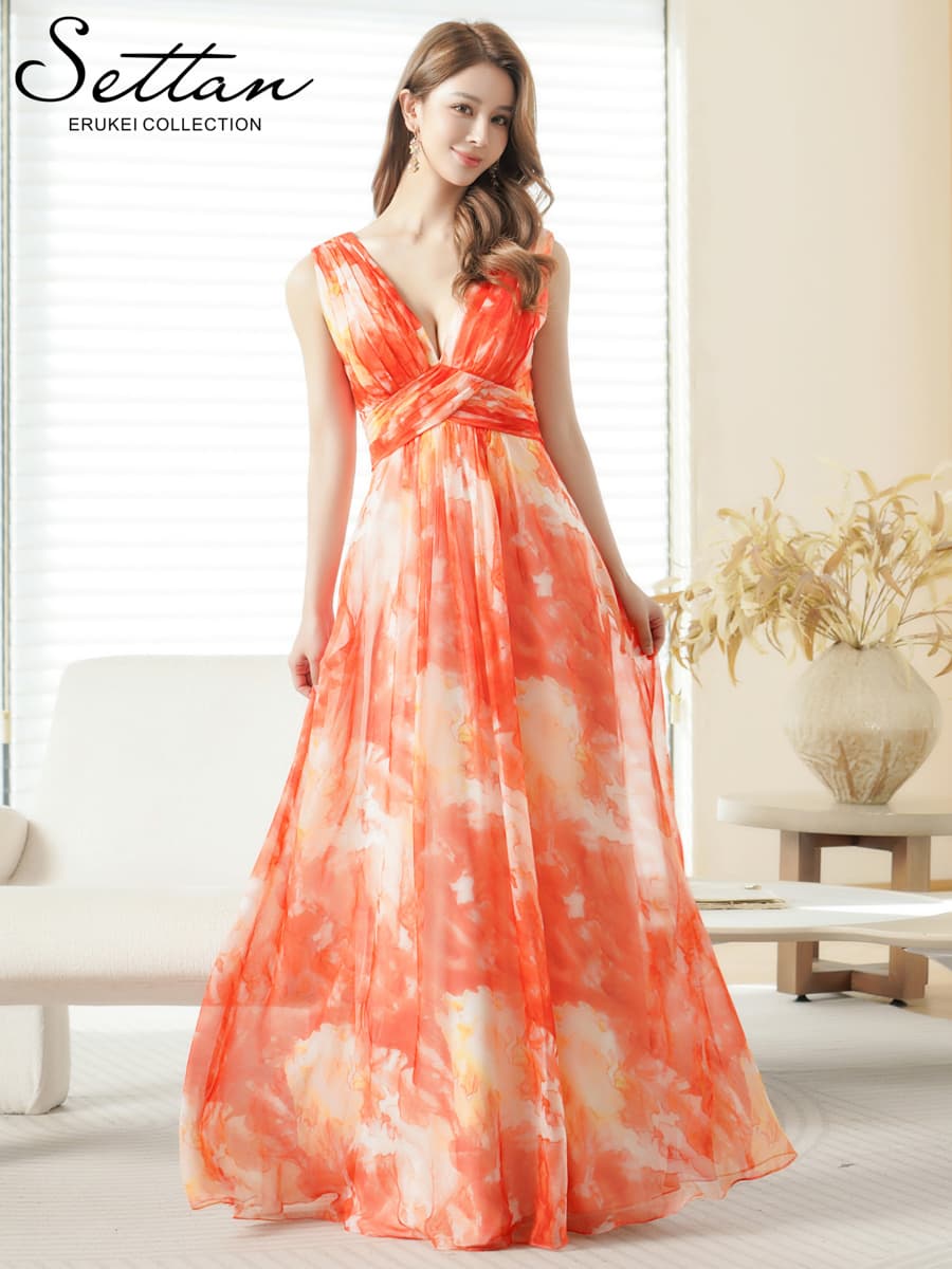 XS-Lサイズあり【SETTAN/セッタン】滲み/ プリント/ シフォン/ Vネック/ バストタック/ ギャザー/ Aライン/ ワンピース/ ロングドレス/ キャバドレス[OF2] [LKS37908-OR-S2602]