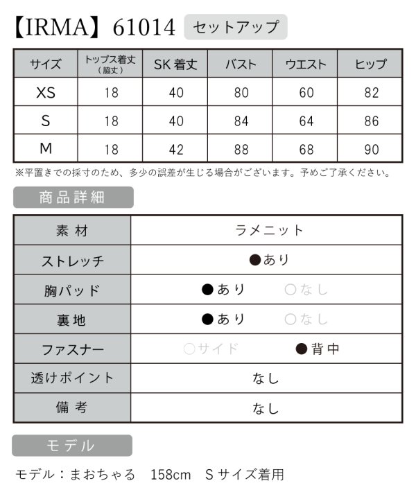 B:80 / W:60 / H:82 [着丈]トップス(脇下):約18cm スカート:約40cm |