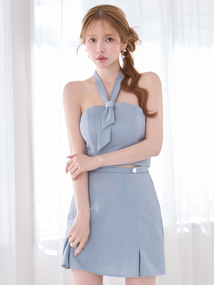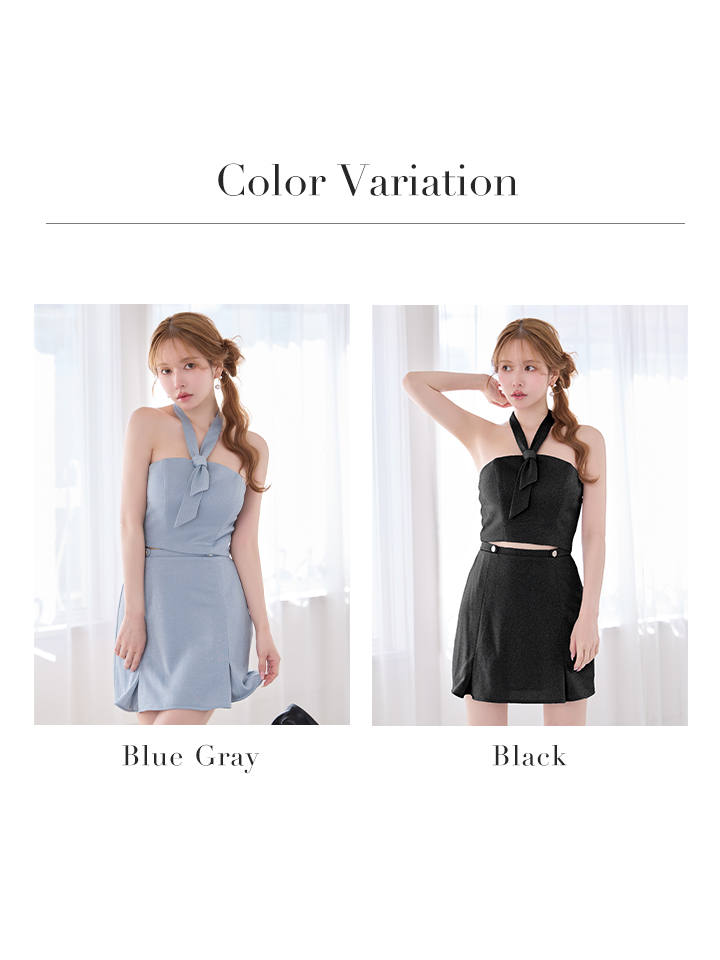XSサイズあり【IRMA/イルマ】ラメニット/ ネクタイ風/ ホルターネック/ ノースリーブ/ ストレッチ/ フレア/ セットアップ/ ミニドレス/ キャバドレス[OF2A] [61014-IR-BLGY-S260204]