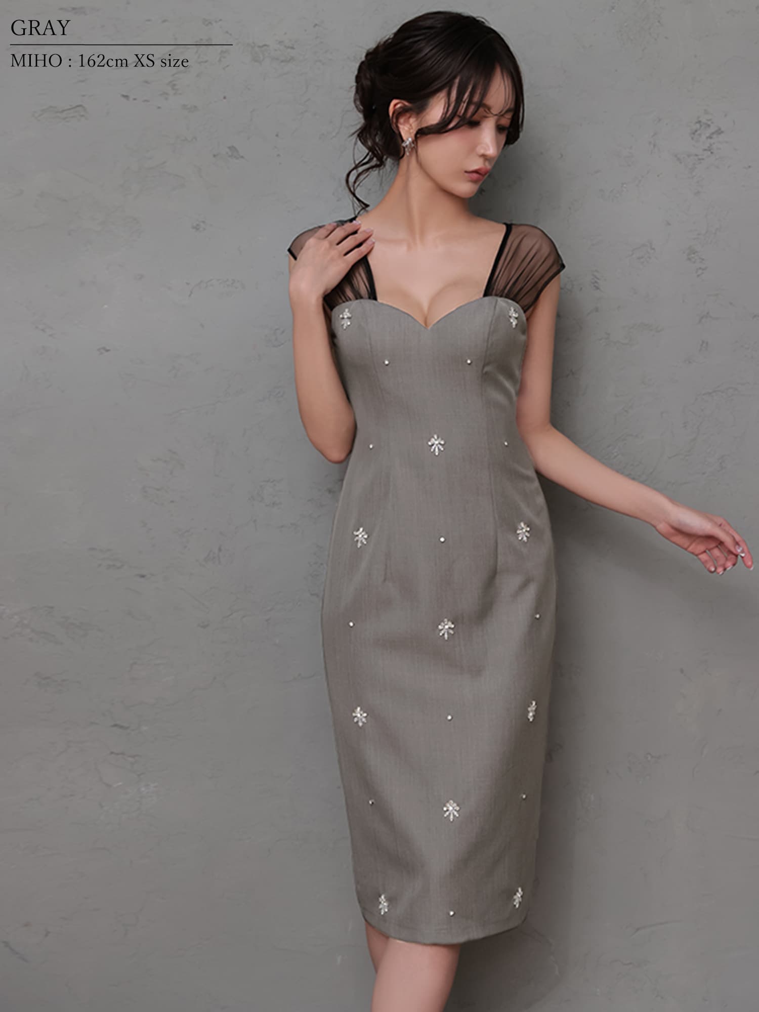 - > XSサイズあり【Veautt/ヴュート】【OF05】シアーショルダー/ ビジュー/ タイト/ ミディアムドレス/ キャバドレス