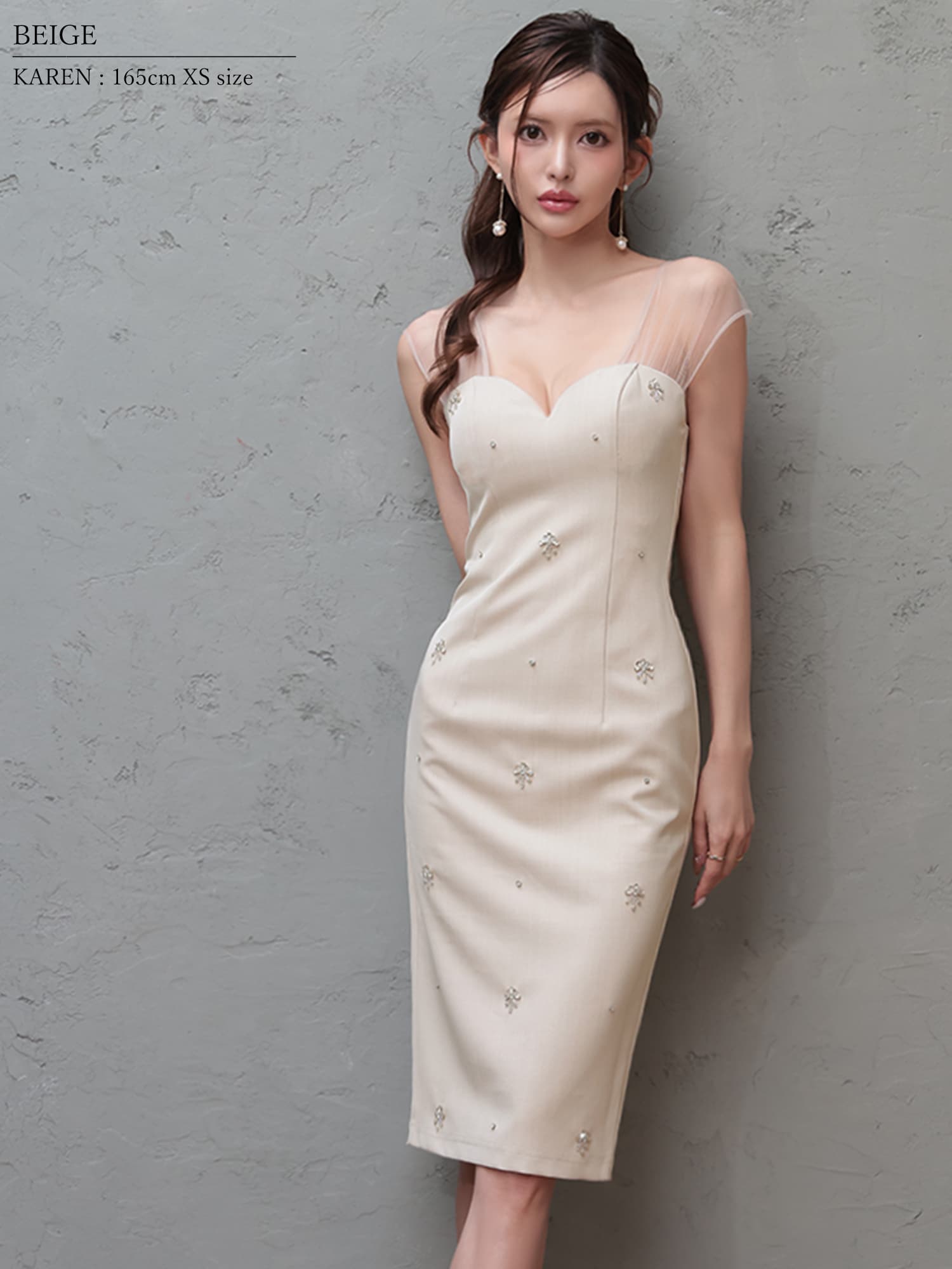 XSサイズあり【Veautt/ヴュート】【OF05】シアーショルダー/ ビジュー/ タイト/ ミディアムドレス/ キャバドレス