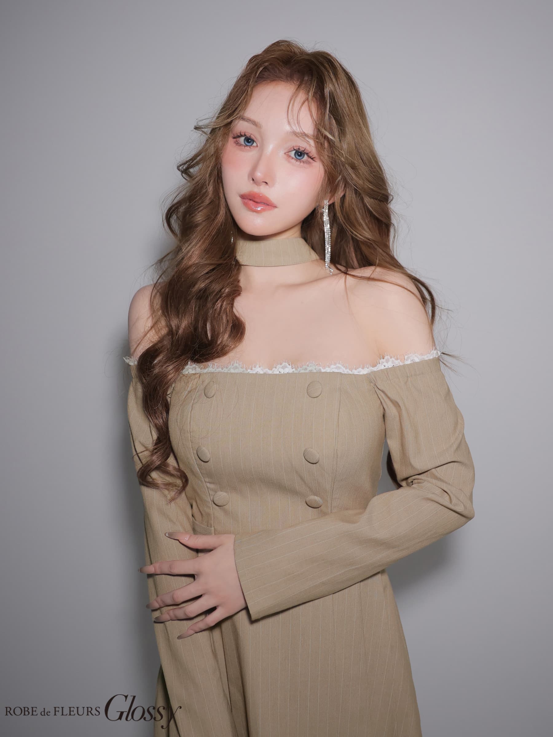 【予約商品/2月上旬発送予定】XSサイズあり【Glossy/グロッシー】ダブルボタン/ ストライプ / フレア/ ミニドレス / キャバドレス[OF08] [GL4800-BE-S260204]