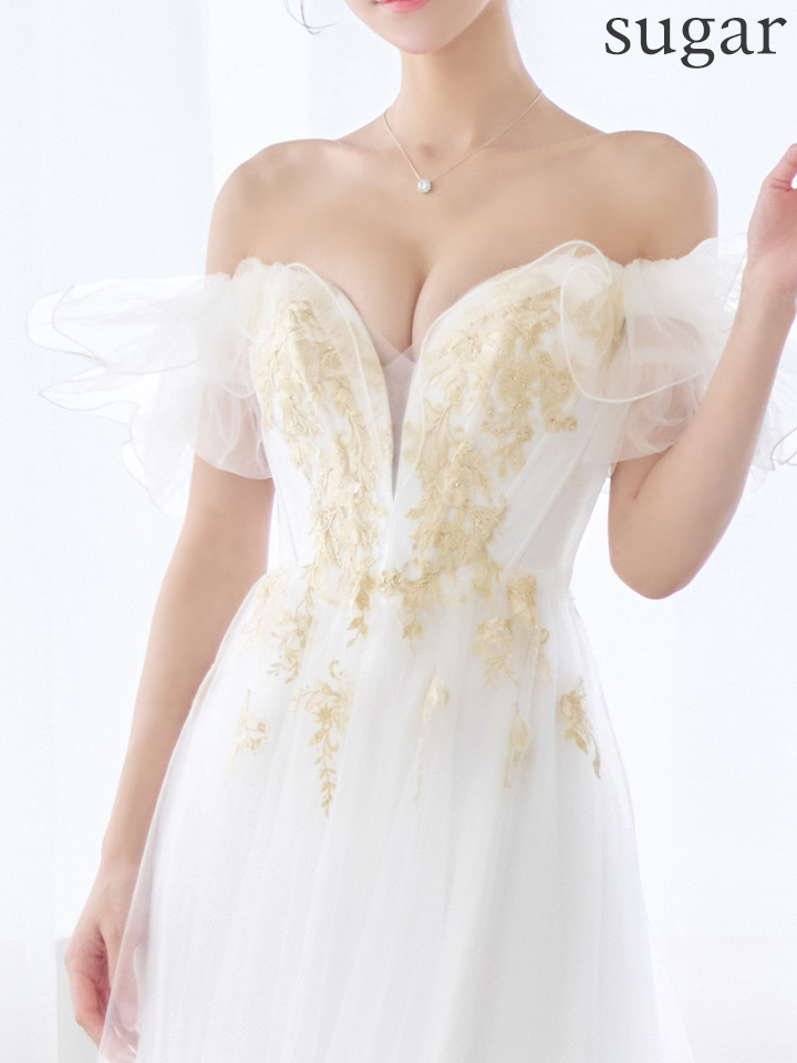【JEAN MACLEAN/ジャンマクレーン】ボリュームフリルスリーブ/ オフショル/ シアー/ フラワー刺繍/ チュール/ フレア/ Aライン/ プリンセス/ ロングドレス/ キャバドレス long[OF2A] [51006-JM-W-S260207]