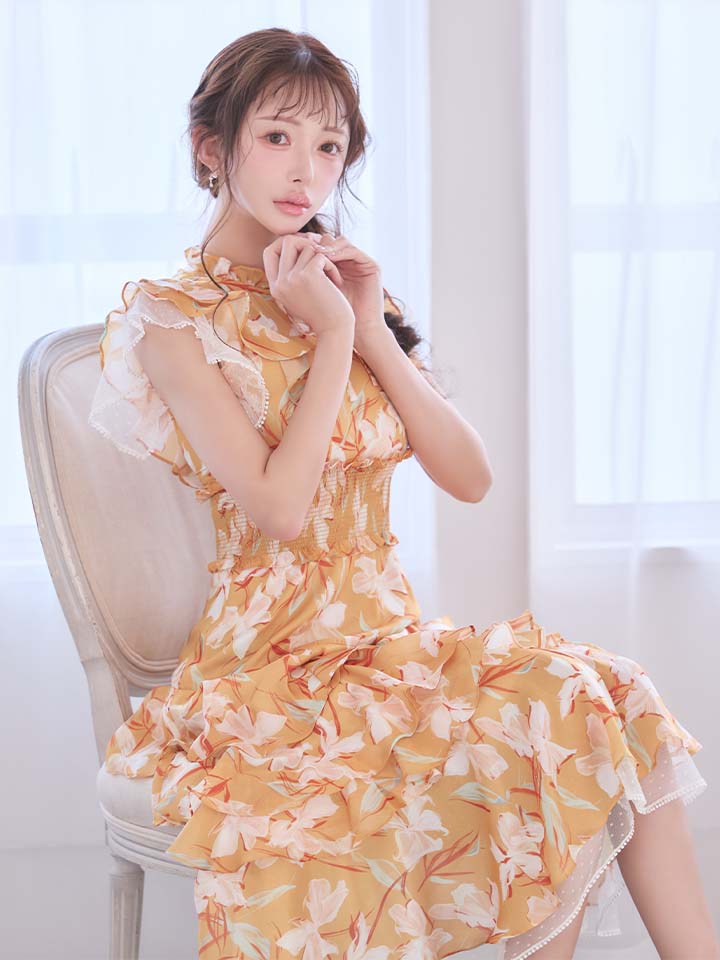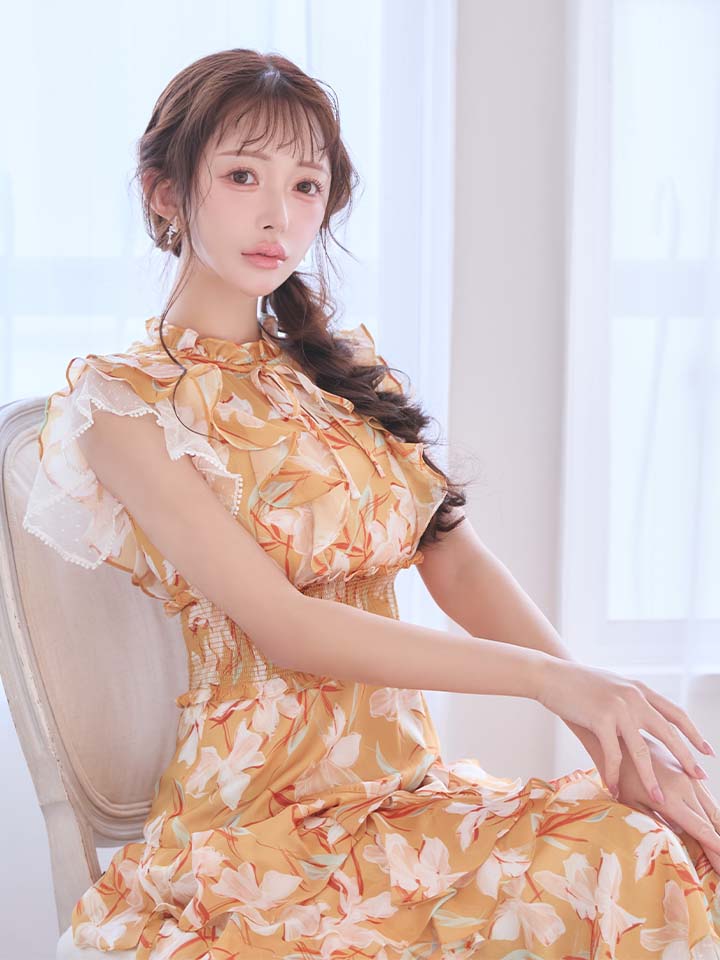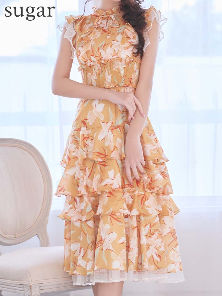 - > XS-Lサイズあり【SETTAN/セッタン】花柄/ シフォン/ フリルスリーブ/ プチハイネック/ ティアード/ Aライン/ ワンピース/ ミディアムドレス/ キャバドレス[OF2]
