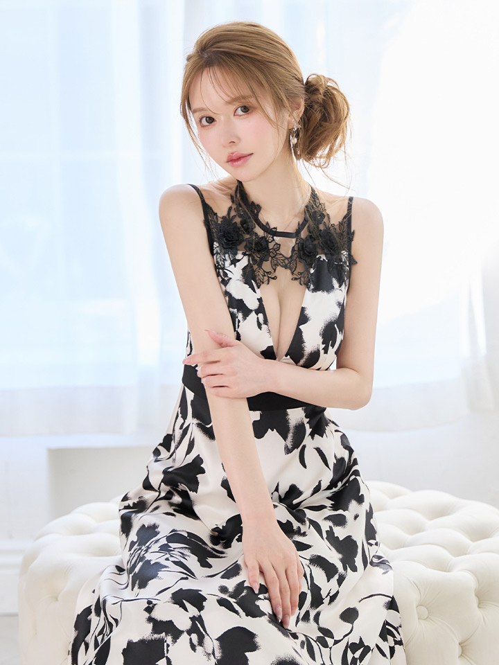 XS-Lサイズあり【SETTAN/セッタン】花柄プリント/ バストシアー/ 立体フラワーレース/ ハイウエスト切り替え/ フレア/ ワンピース/ ロングドレス/ キャバドレス long[OF2]