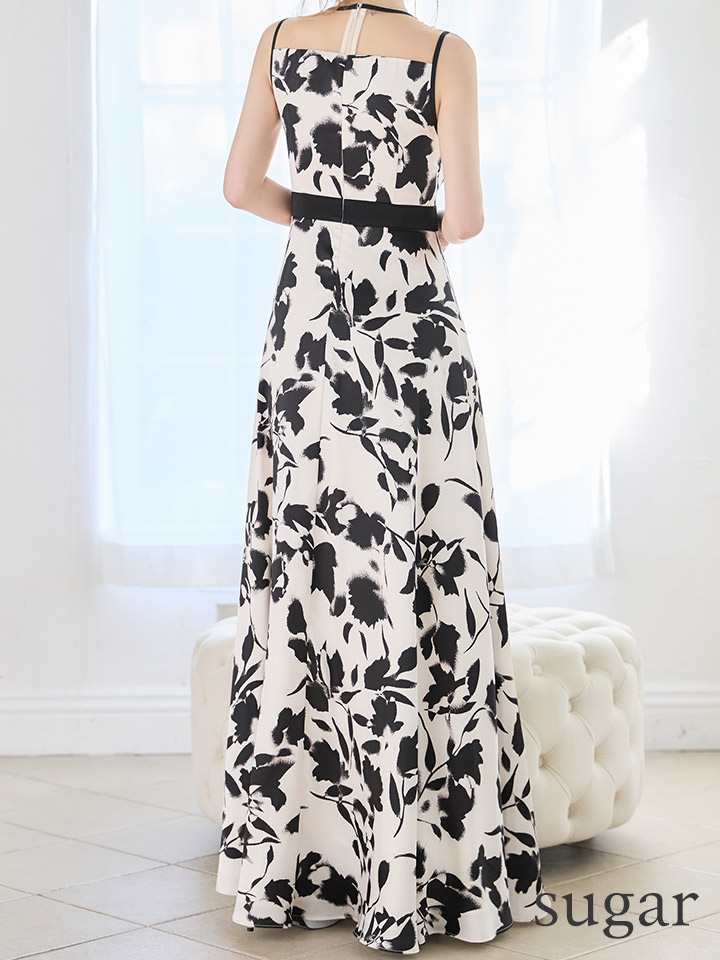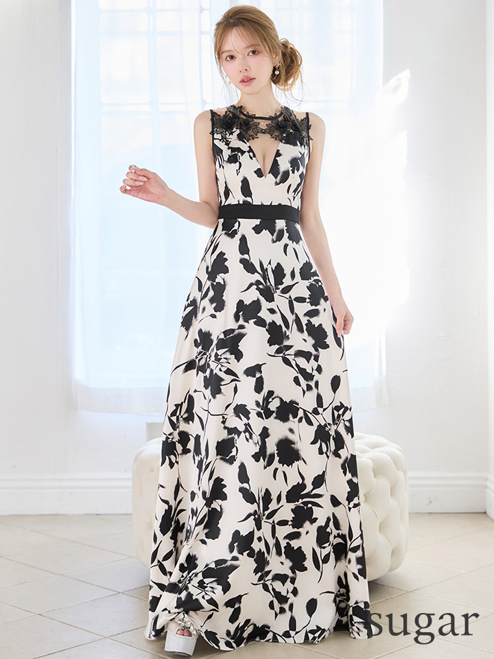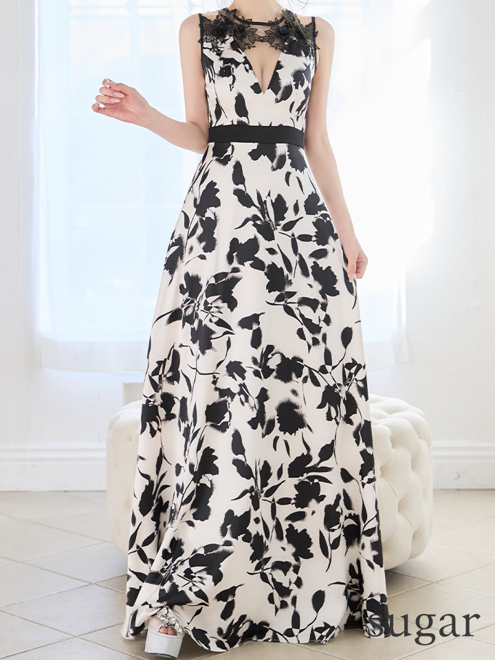 XS-Lサイズあり【SETTAN/セッタン】花柄プリント/ バストシアー/ 立体フラワーレース/ ハイウエスト切り替え/ フレア/ ワンピース/ ロングドレス/ キャバドレス long[OF2] [LKS25345-BxW-S2602]