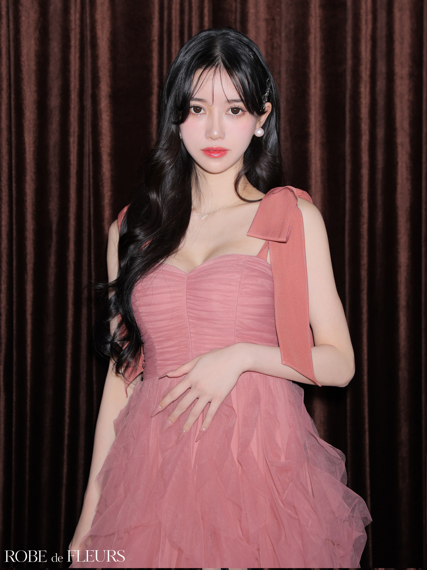 肩に施した大きなリボンがボディラインを華奢に見せてくれます。
