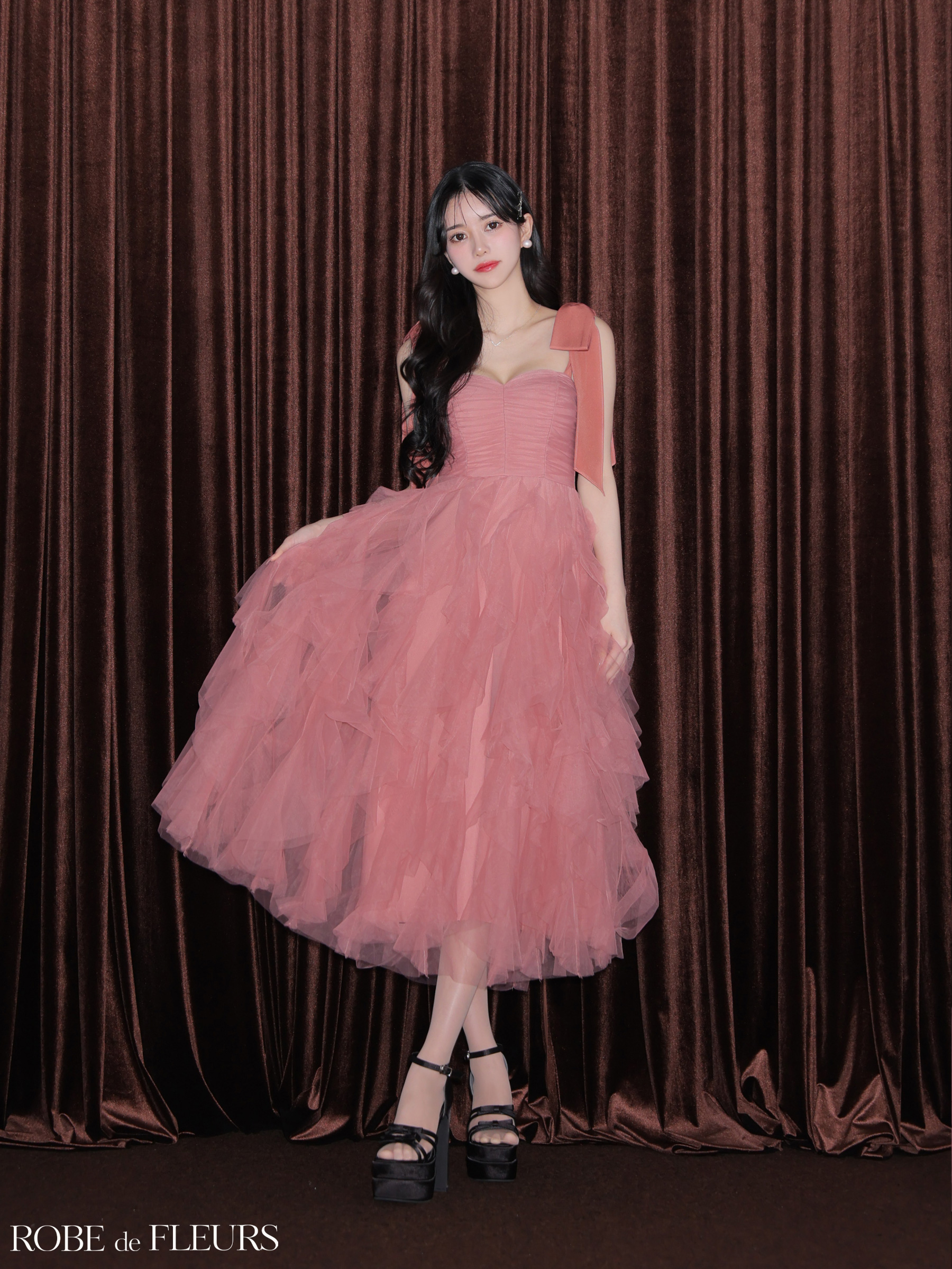 - > XS-Lサイズあり【ROBE de FLEURS/ローブドフルール】ボリュームチュール/ ショルダーリボン/ フレア/ ワンピース/ ミディアムドレス/ キャバドレス[OF08]【一部予約商品/2月下旬発送予定】