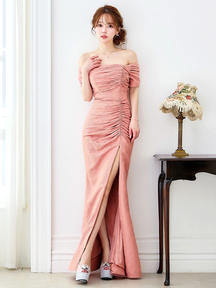 Lサイズあり【UNA VALERIE / ウナヴァレリェ】マーメイド/ フラワージャガード/ オフショル/ スリット/ タック/ ロングドレス/ キャバドレス long[OF05] [V60249L-DusP-S2602]