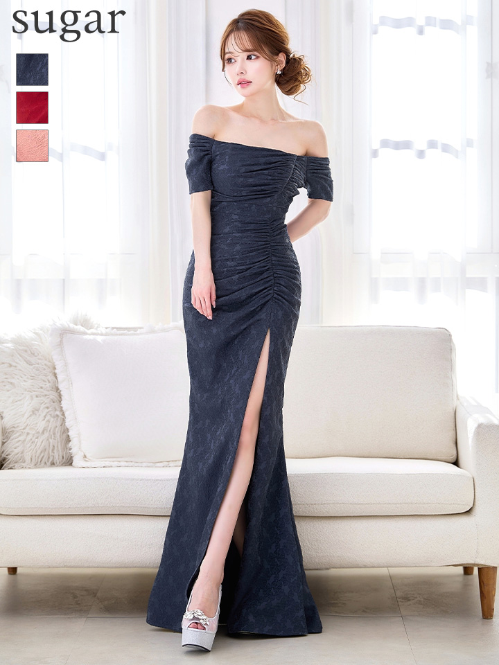 Lサイズあり【UNA VALERIE / ウナヴァレリェ】マーメイド/ フラワージャガード/ オフショル/ スリット/ タック/ ロングドレス/ キャバドレス long[OF05]