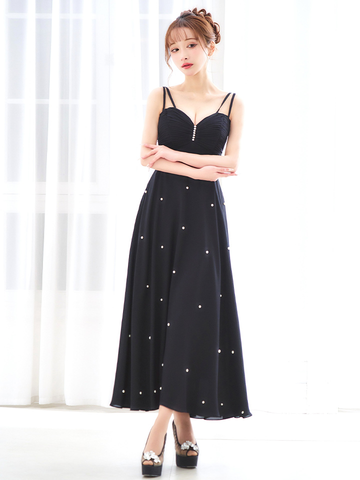 Lサイズあり【ISA FERRIS/ イサフェリス】【OF05】シンプル/ キャミソール/ パール/ フレア/ Aライン/ ミモレ丈/ ワンピース/ ミディアムドレス/ キャバドレス [F60238HL-B-S2602]