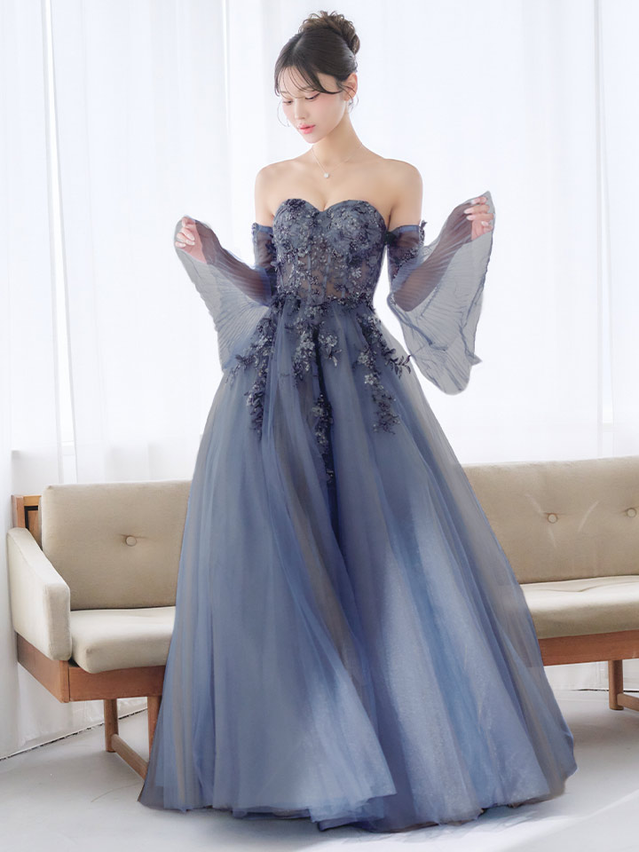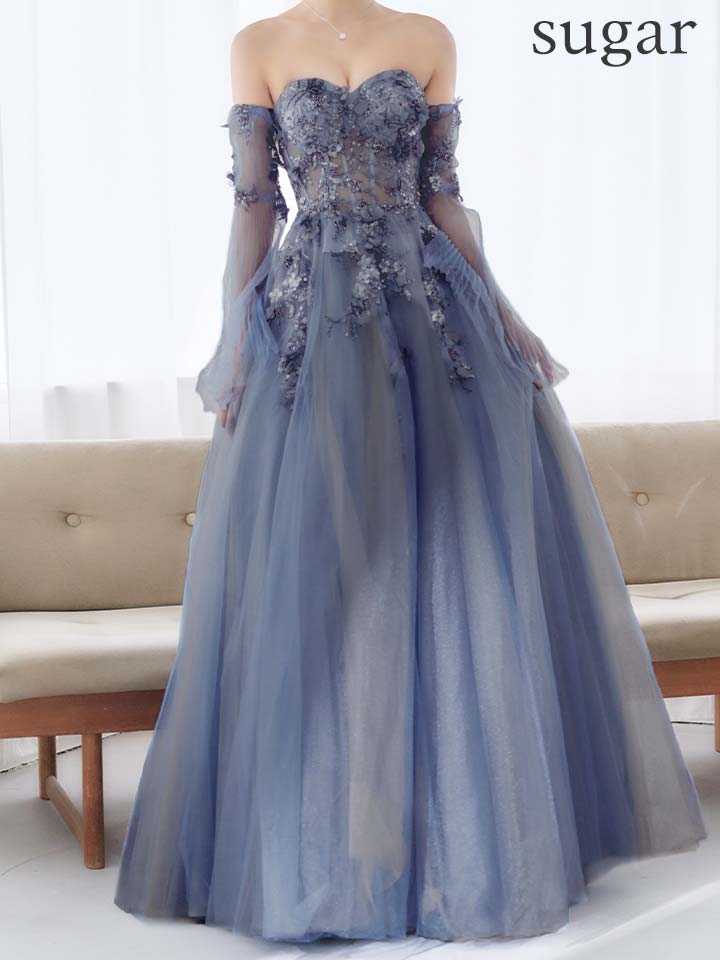 【JEAN MACLEAN/ジャンマクレーン】チョーカー/ 袖付き/ 2way/ オフショル/ ロングスリーブ/ 立体フラワー/ シアー/ チュール/ スパンコール/ ビーズ刺繍/ フレア/ プリンセス/ ロングドレス/ キャバドレス long[OF2A]