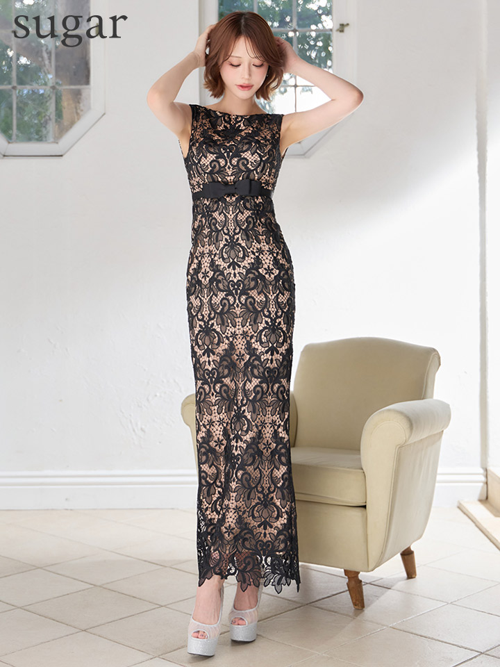 総レースがエレガントで気品あふれるタイトロングドレス。
