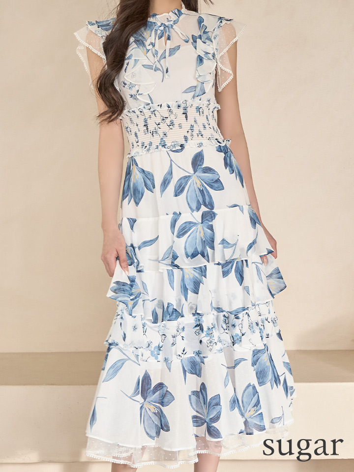 XS-Lサイズあり【SETTAN/セッタン】フラワープリント/ ティアード/ フリルスリーブ/ Aライン/ シフォン/ ワンピース/ ミディアムドレス/ キャバドレス[OF2] [LKS91208-WxBL-S260210]