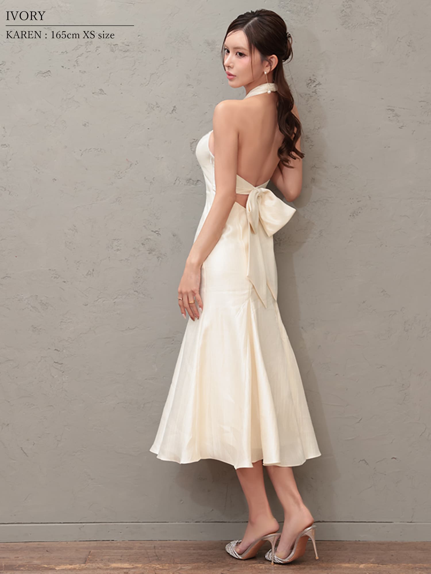 背中は大胆に開いたバックスタイルに、リボンディテールを添えて後ろ姿まで美しく演出。