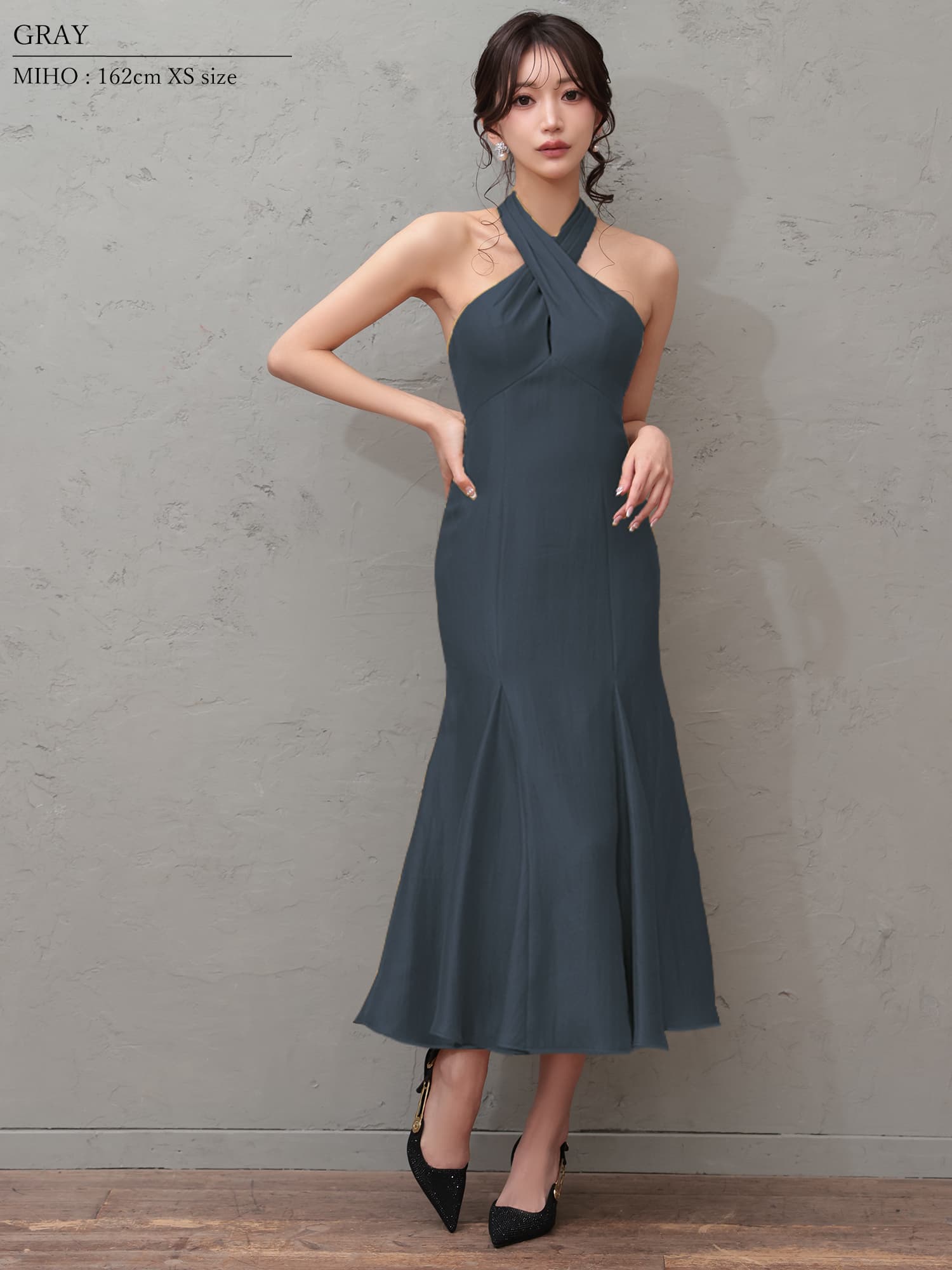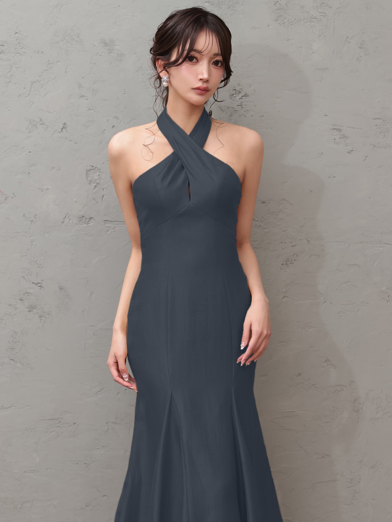 首元でクロスするホルターネックデザインが、洗練された印象を与えるロングドレス。
