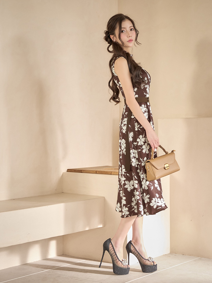 XS-Lサイズあり【GINZA COUTURE/銀座クチュール】フラワープリント/ バイカラー/ ベルト/ ノースリーブ/ ハイネック/ Aライン/ フレア/ ワンピース/ ミディアムドレス/ キャバドレス[OF2] [LKC25295-BRxW-S260210]