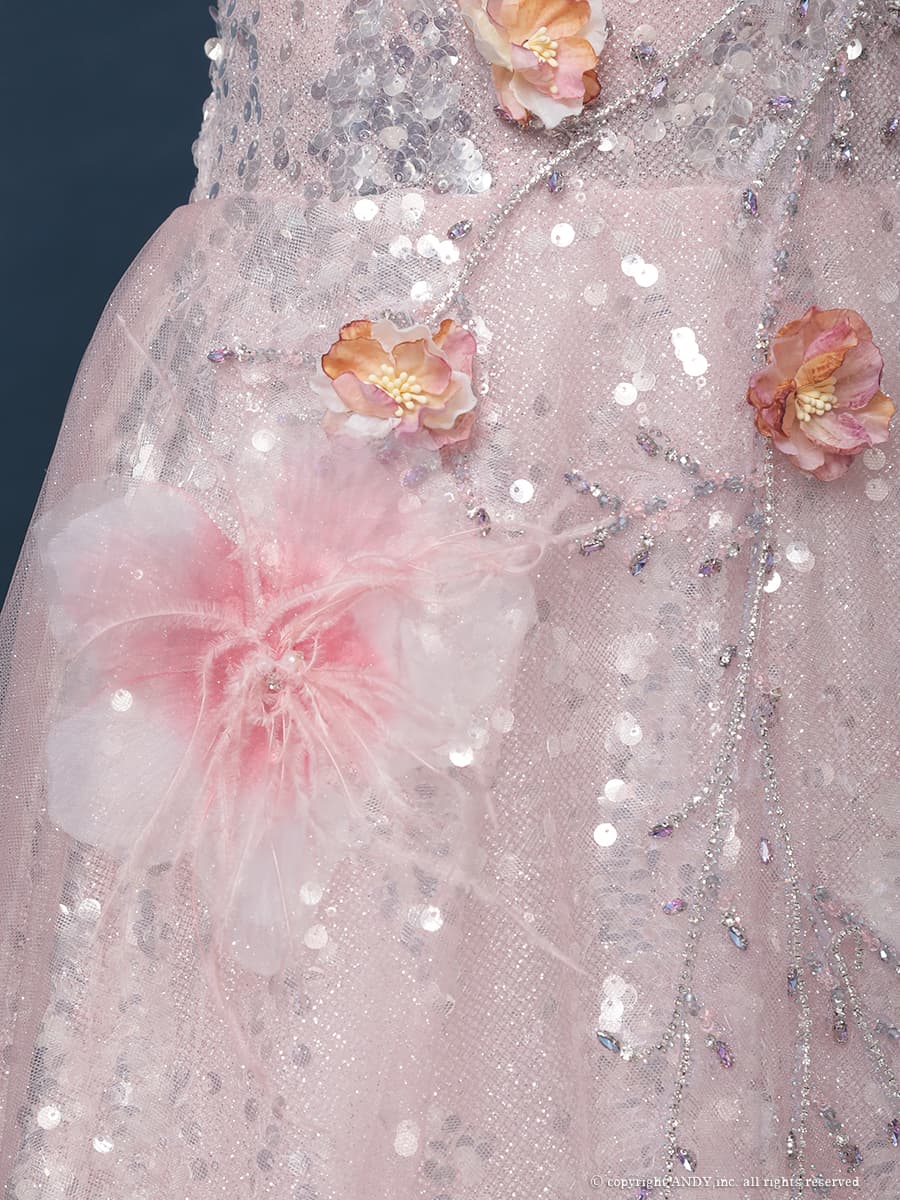 ショルダー部分にはレースフラワーとフェザーをあしらい、デコルテを華やかに演出。