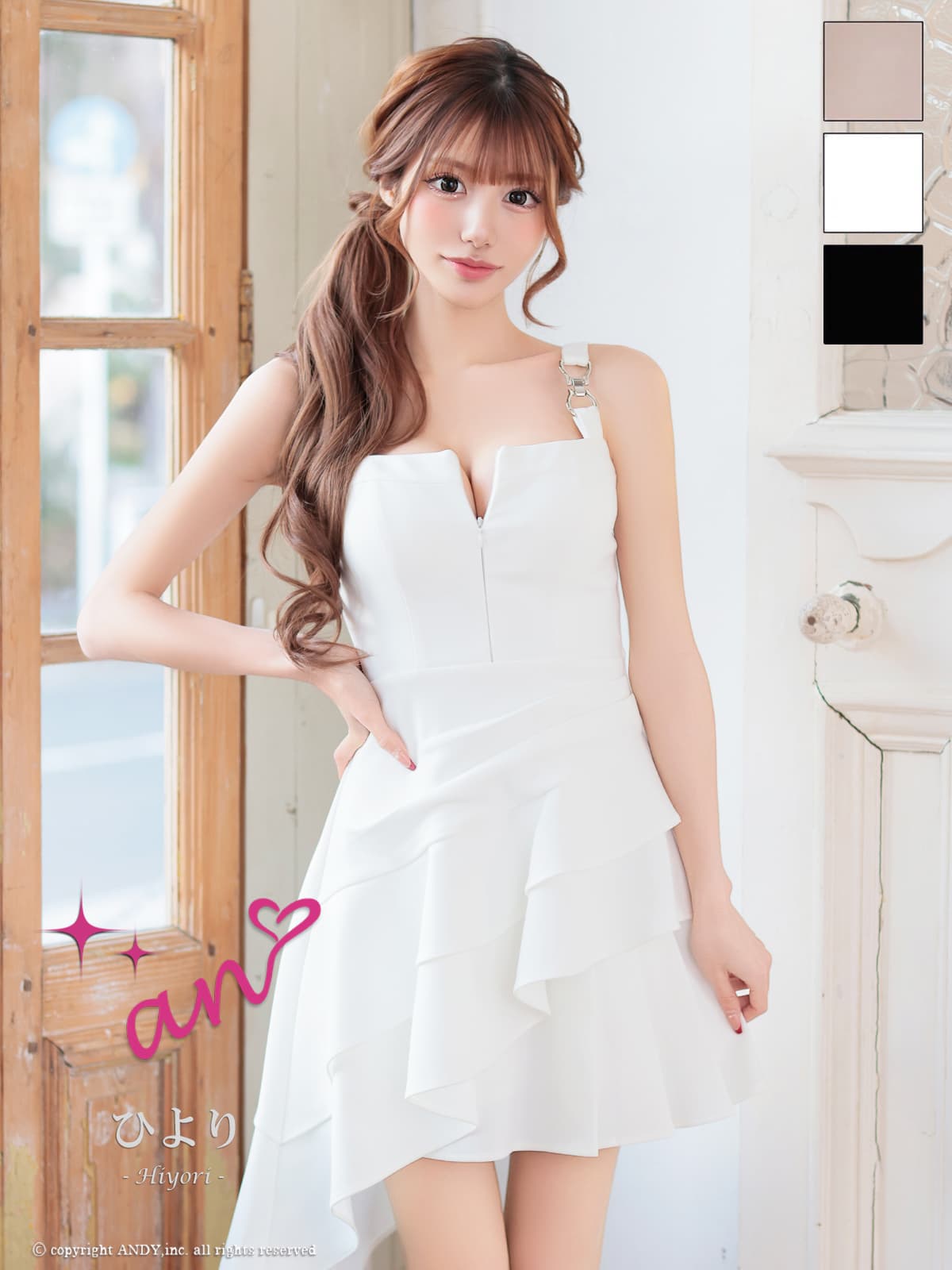XSサイズあり【an/アン】ノースリーブ/ バストジップ/ アシンメトリー/ ショルダーバックル/ フリル/ フレア/ ミニドレス/ キャバドレス[OF05] [AOC4057-W-2602]