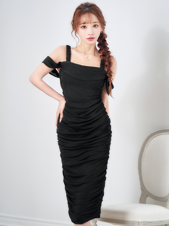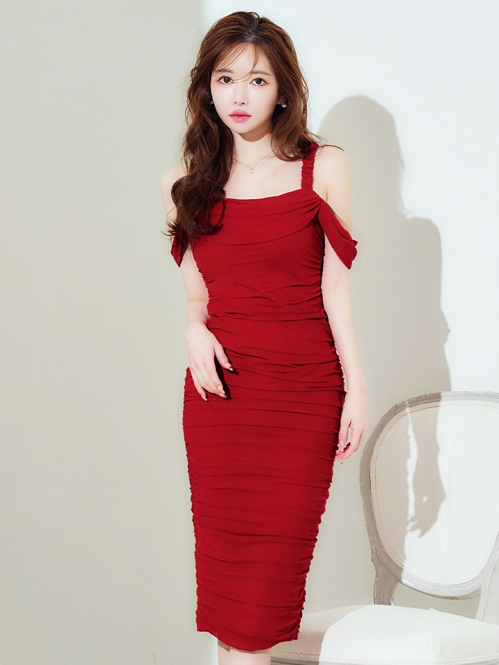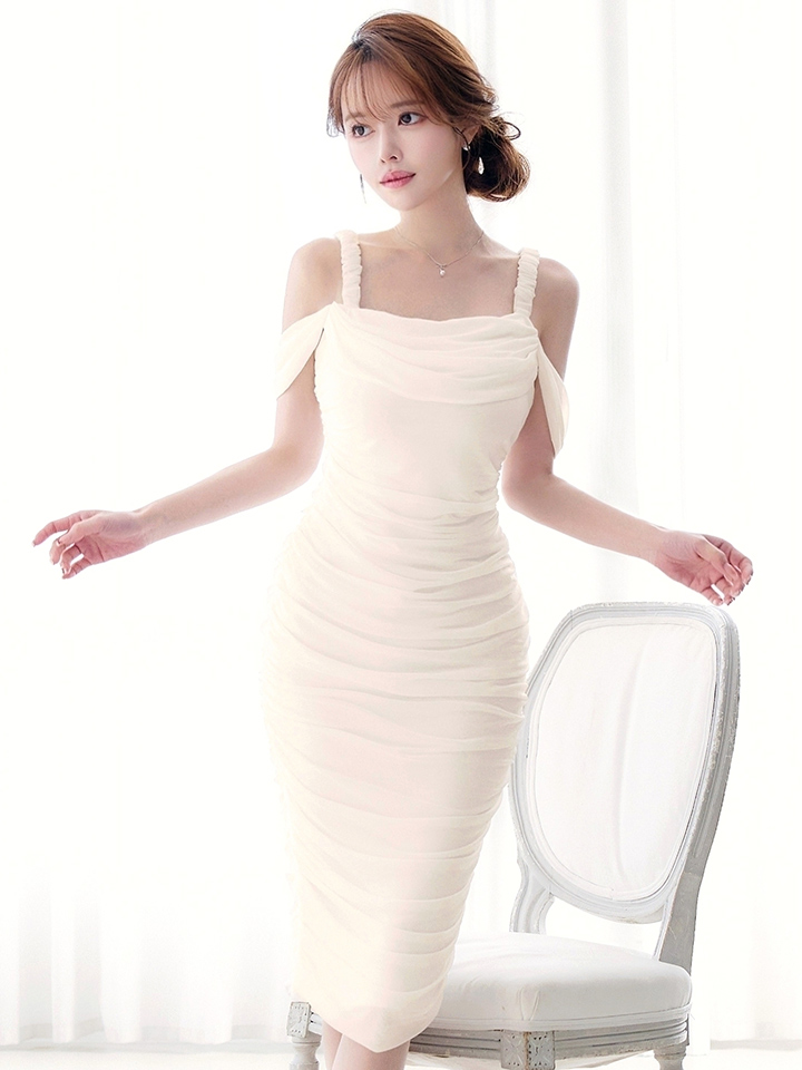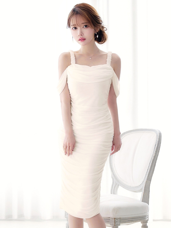 オフショルで肩出しした上品なミディアムドレス