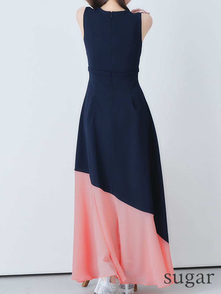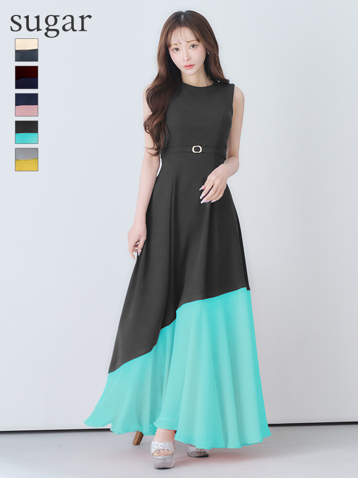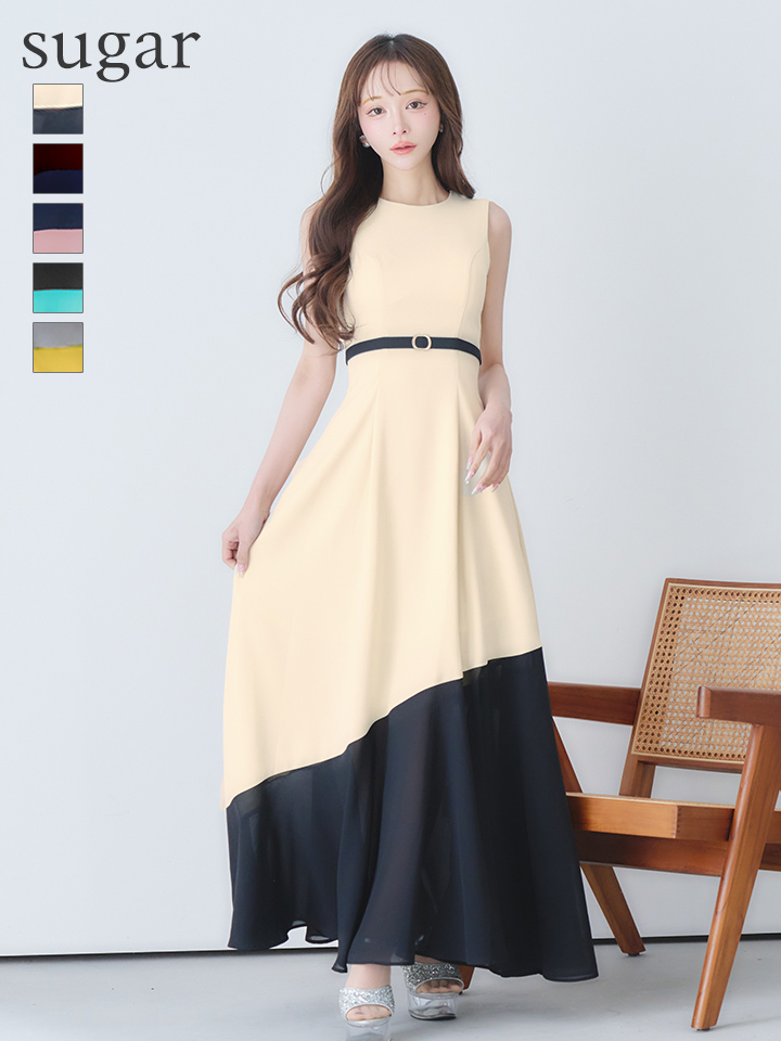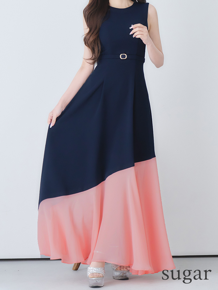 【VELIQUE/ヴェリーク】バイカラー/ ベルト/ ノースリーブ/ フレア/ Aライン/ ロングドレス/ キャバドレスlong【HC02】