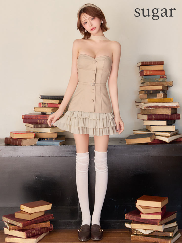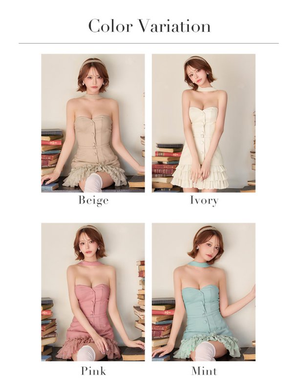 XSサイズあり【ANGEL R/エンジェルアール】ベアトップ/ チョーカーデザイン/ ボタン/ ウエストベルト/ フリル/ フレア/ マイクロミニ/ ミニドレス/ キャバドレス[OF2]