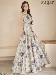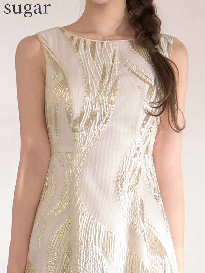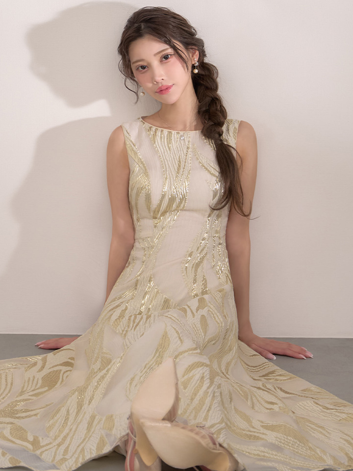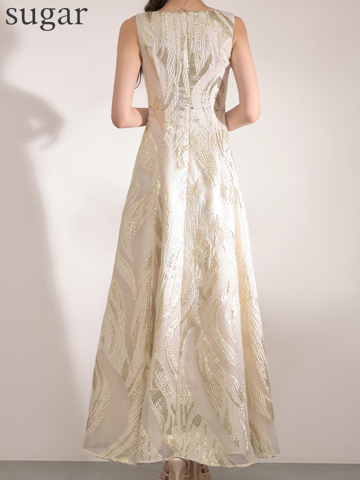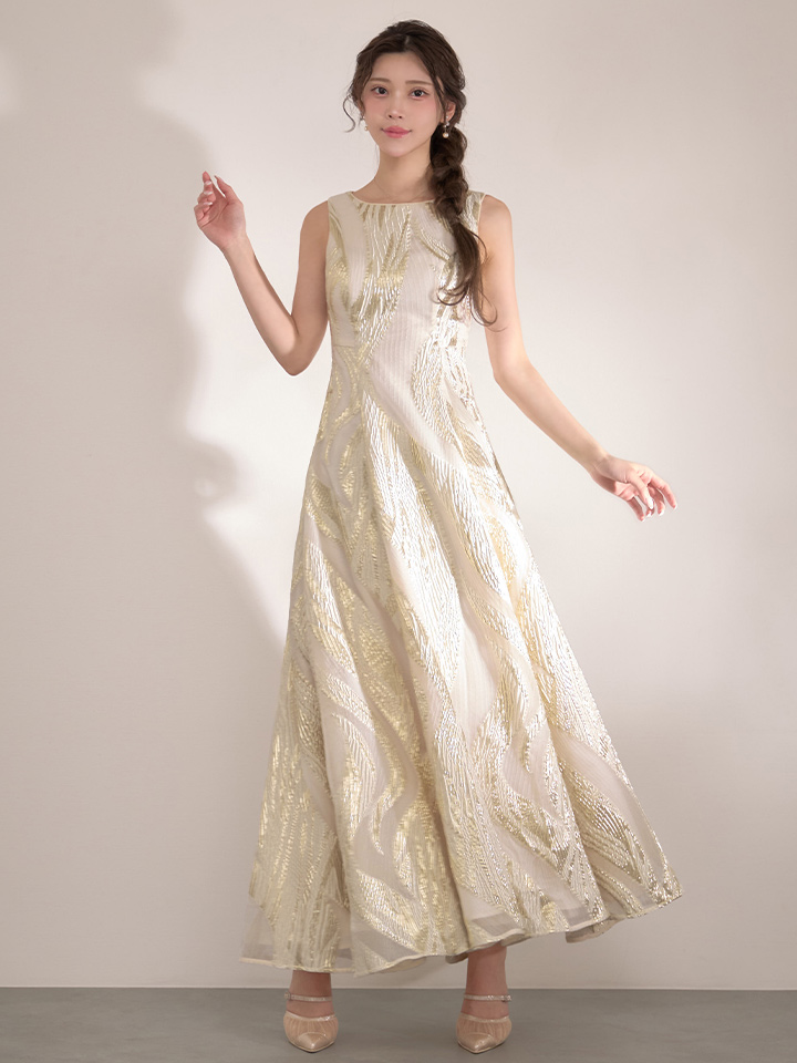 XS-Lサイズあり【SETTAN/セッタン】金糸/ プリント/ オーガンジー/ ボートネック/ ノースリーブ/ フレア/ ワンピース/ ロングドレス / キャバドレス long[OF2] [LKS25296-IV-S2602]