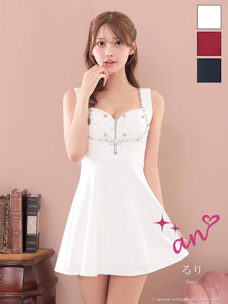 XSサイズあり【an/アン】リボンブローチ付き/ ビジュー/ ノースリーブ/ バストジップ/ レース/ ダイヤ柄/ ストレッチ/ フレア/ ミニドレス/ キャバドレス[OF05] [AOC4070-W-2602]