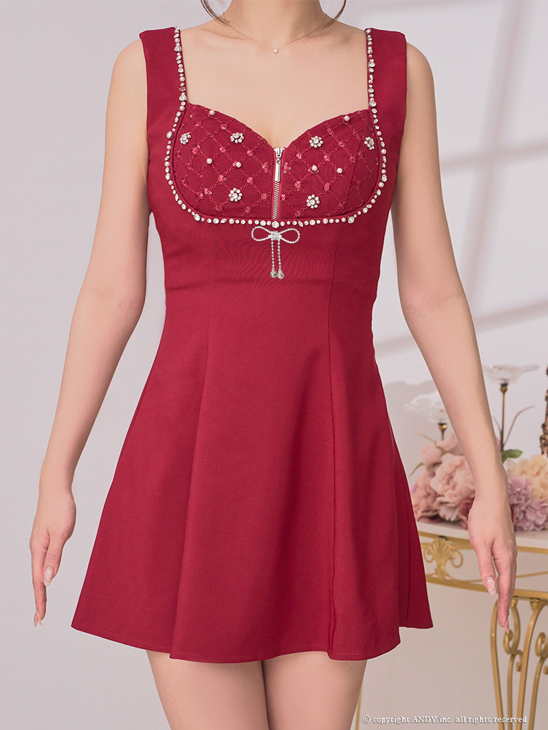 バストを囲むようにパールとラインストーンが煌めくフレアミニドレス。