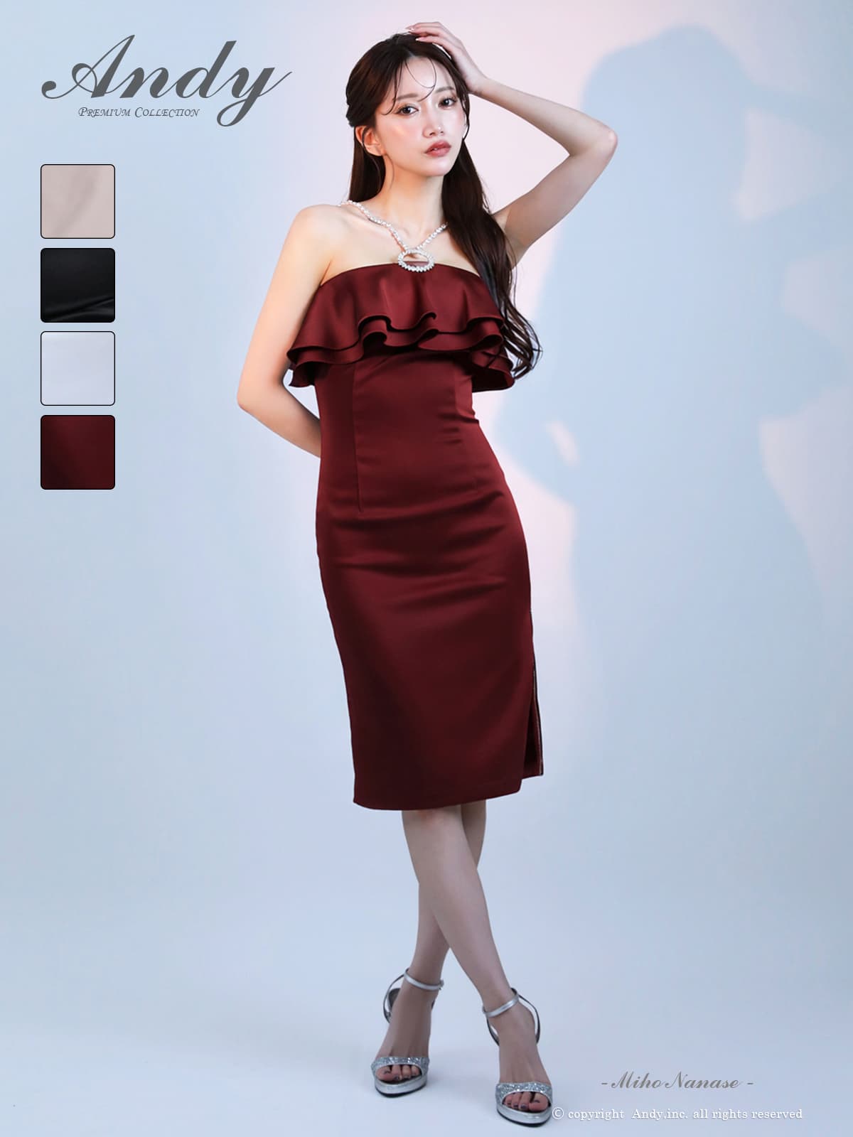 XSサイズあり【ANDY/アンディ】ビジューストラップ付き/ ワンカラー/ 2WAY/ フリル/ ベア/ タイト/ スリット/ ミディアムドレス/ キャバドレス[OF05]