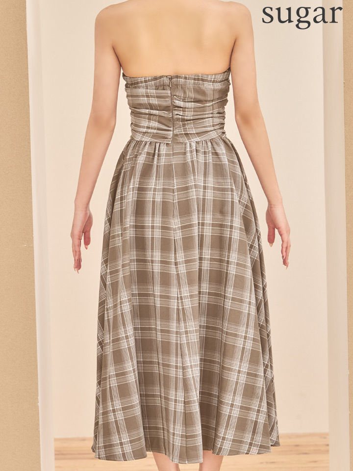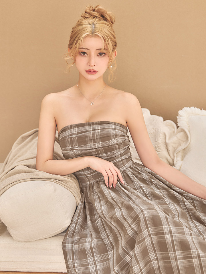 - > XSサイズあり【Veautt/ヴュート】【OF05】ベアトップ/ ギャザー/ チェック/ 2way/ フレア/ ワンピース/ ミディアムドレス/ キャバドレス