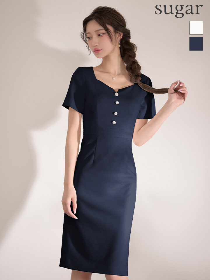 ビジューボタンが目を惹く大人可愛いミディアムドレス