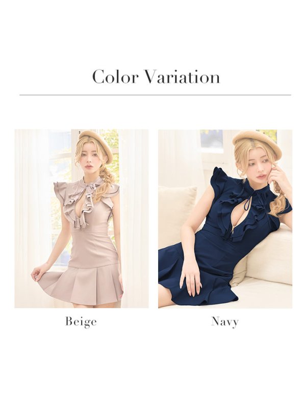XSサイズあり【an /アン】ショルダーフリル/ プチハイネック/ バストジップ/ フレンチスリーブ/ プリーツ/ リボン/ ストレッチ/ フレア/ Aライン/ ミニドレス/ キャバドレス[OF05] [AOC4058-BE-S260220]