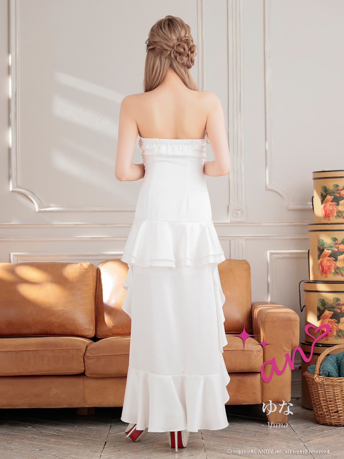 XSサイズあり【an /アン】 バストジップ/ ベア/ ラインストーン/ アシンメトリー/ サイドギャザー/ テールカット/ ティアードフリル/ ロングドレス/ キャバドレス[OF05