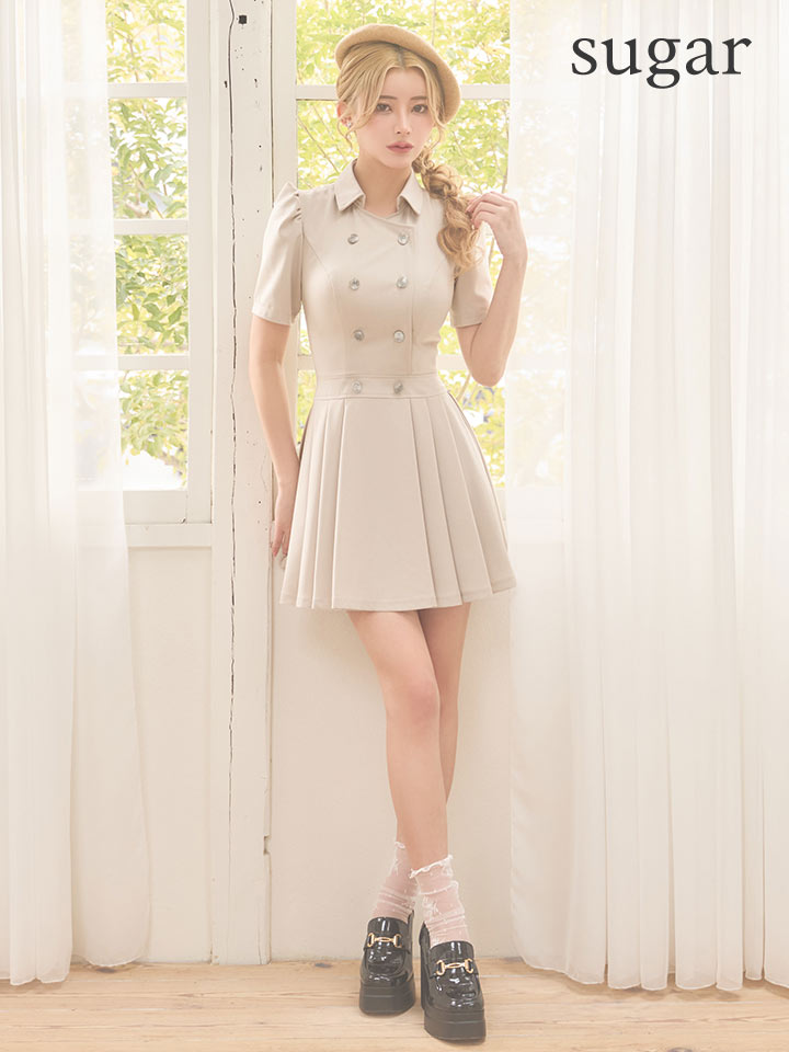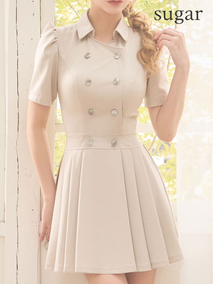 【予約商品/2月下旬発送予定】XSサイズあり【IRMA/イルマ】袖あり/ パフスリーブ/ 襟付き/ プリーツ/ ダブルボタン/ ストレッチ/ 半袖/ ハイウエスト/ フレア/ ミニドレス/ キャバドレス[OF2A] [61045-IR-SandBE-S260220]