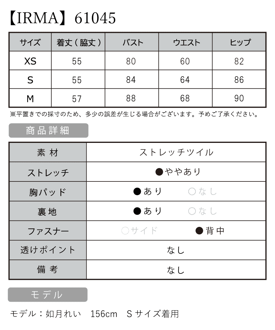 B:84 / W:64 / H:86 [着丈](脇丈):約55cm |