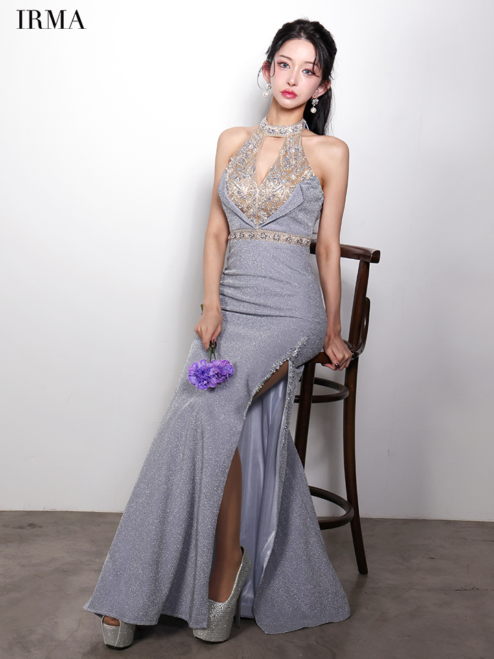 【予約商品/2月下旬発送予定】【IRMA/イルマ】ホルターネック/ ビジュー/ ラメニット/ ラインストーン / 刺繍/ バストカットアウト/ スリット/ ロングドレス/ キャバドレス long[OF2A] [61057-IR-PBL-2602]