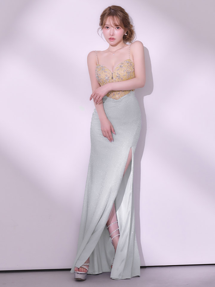 【予約商品/2月下旬発送予定】【IRMA/イルマ】オーロラビジュー/ ラメニット/ キャミ/ フロントジップ/ ビーズ刺繍/ スリット/ ロングドレス/ キャバドレス long[OF2A]