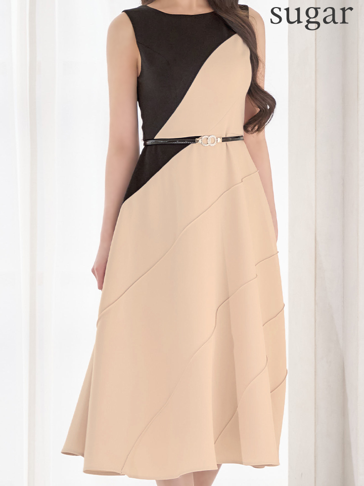 XS-Lサイズあり 【GINZA COUTURE/銀座クチュール】バイカラー/ ベルト/ ノースリーブ/ フレア/ Aライン/ ワンピース/ ミディアムドレス/ キャバドレス[OF2] [LKC25292-BxBE-S2602]