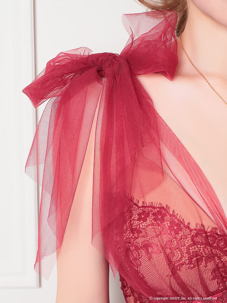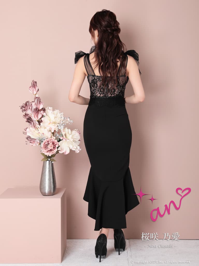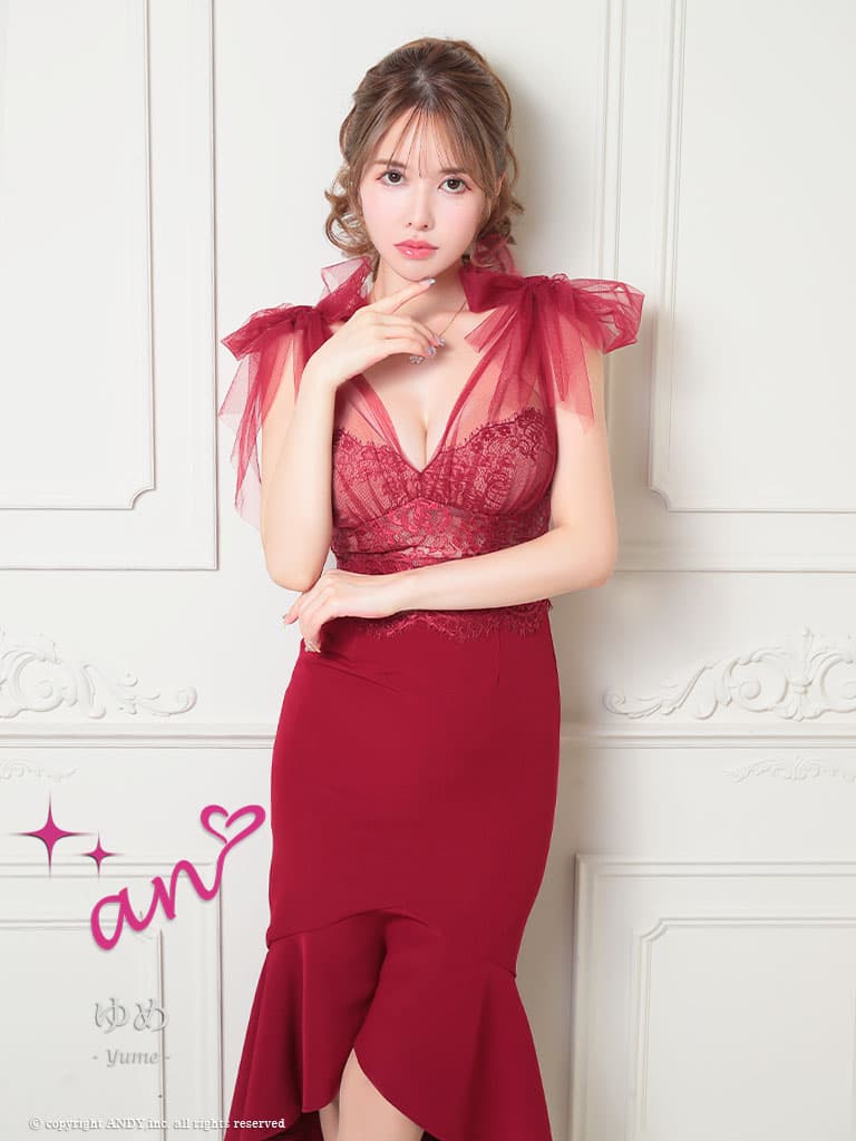 【an /アン】ショルダーリボン/ チュール/ シアーレース/ Vネック/ マーメイド/ テールカット/ ワンピース/ ミディアムドレス/ キャバドレス[OF05]