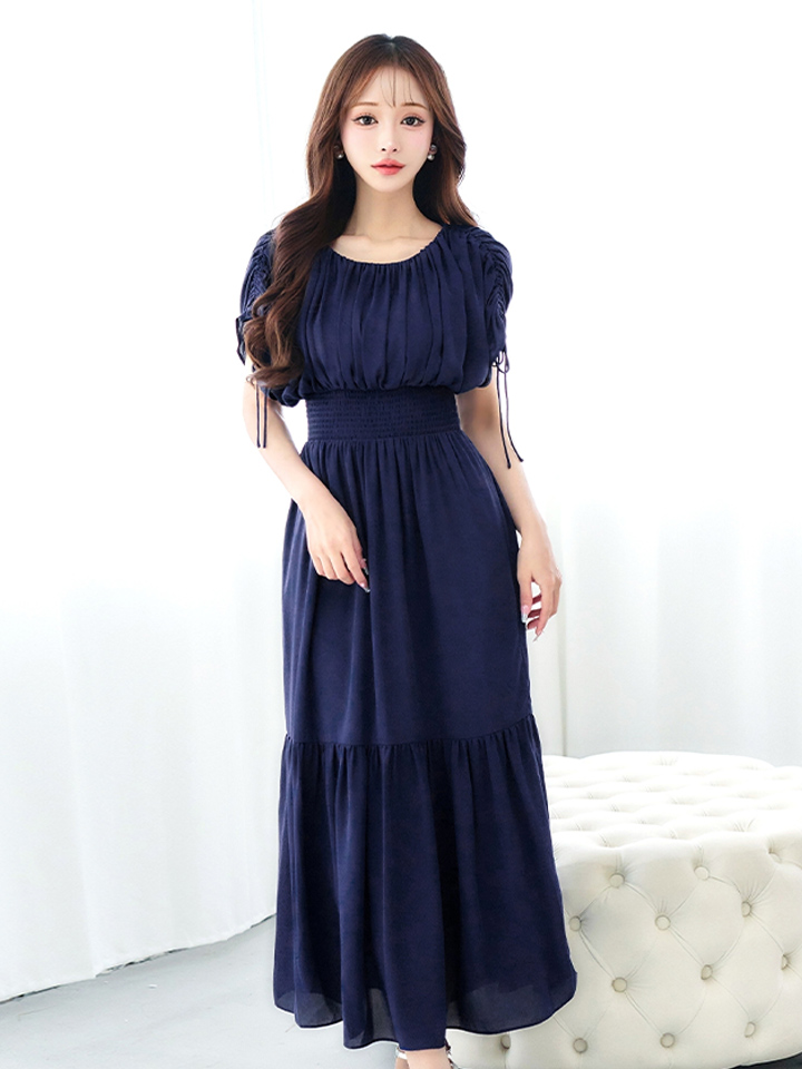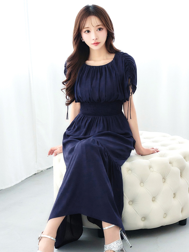 XLサイズあり【AMORA GRACE / アモーラグレース】 オケージョンドレス/ パーティードレス/ お呼ばれドレス/ 無地/ ハーフスリーブ/ ドロスト/ ギャザー/ フレア/ ミモレ丈/ ワンピース/ ミディアムドレス/ キャバドレス[OF05] [G60253HL-NV-S2602]