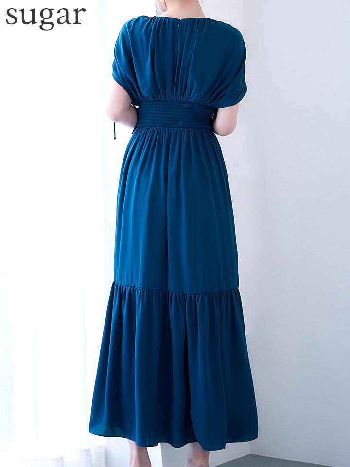 XLサイズあり【AMORA GRACE / アモーラグレース】 オケージョンドレス/ パーティードレス/ お呼ばれドレス/ 無地/ ハーフスリーブ/ ドロスト/ ギャザー/ フレア/ ミモレ丈/ ワンピース/ ミディアムドレス/ キャバドレス[OF05]