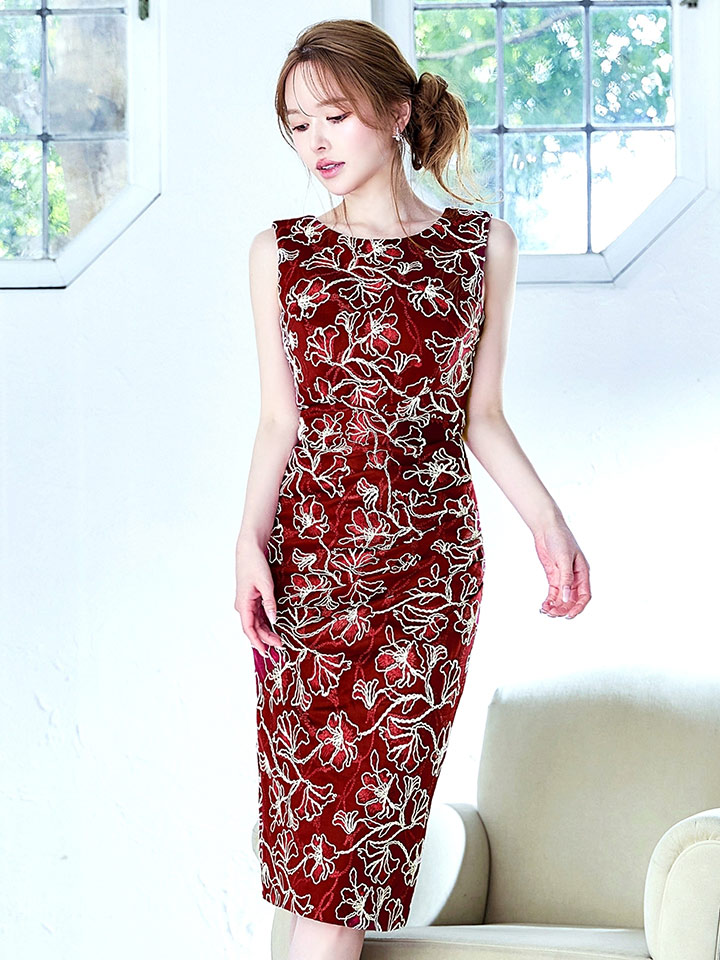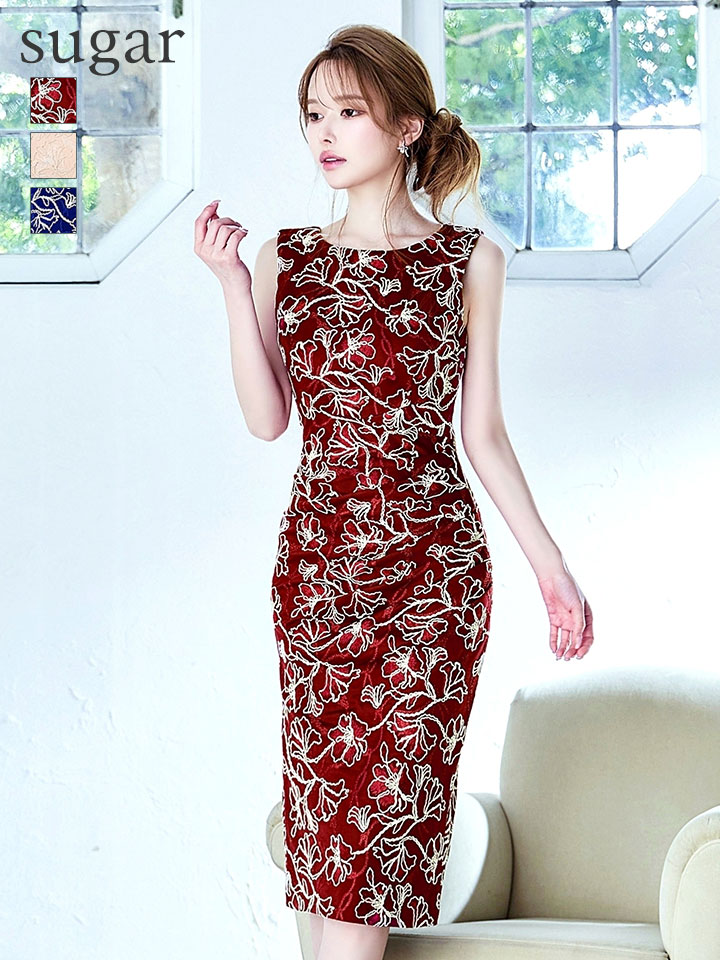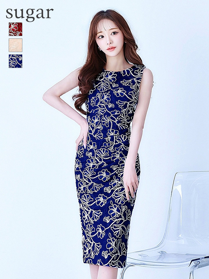 - > XLサイズあり【VANESSA HEART / ヴァネッサハート】【OF05】フラワー刺繍/ ジャガード/ ボートネック/ ノースリーブ/ タック/ ストレッチ/ ひざ丈/ タイト/ ミディアムドレス/ キャバドレス