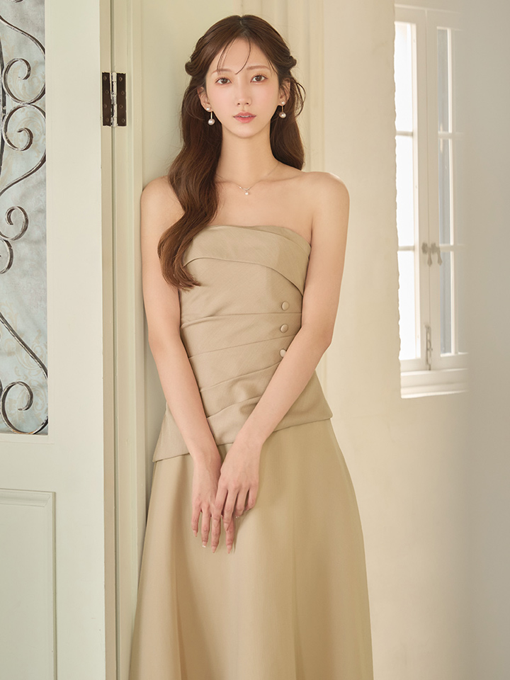 XSサイズあり【Veautt/ヴュート】【OF05】ベアトップ/ スカーフ/ ウエストタック/ ボタン/ シフォン/ 2way/ フレア/ ワンピース/ ミディアムドレス/ キャバドレス [VT032605-BE-S260227]