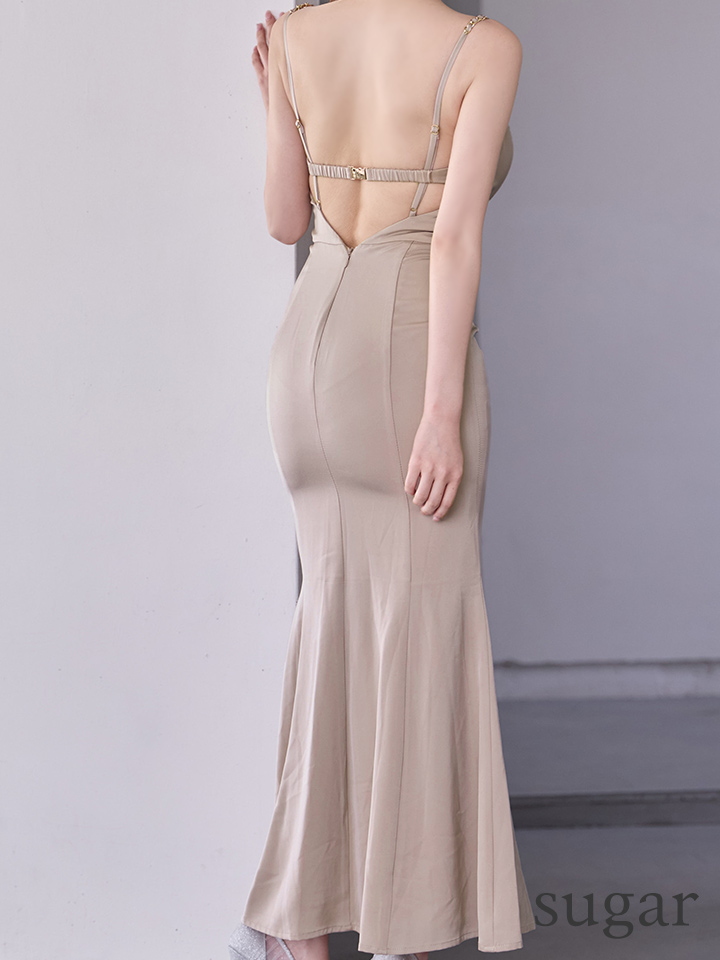 チェーンショルダーが高級感を際立てるマーメイドワンピ。