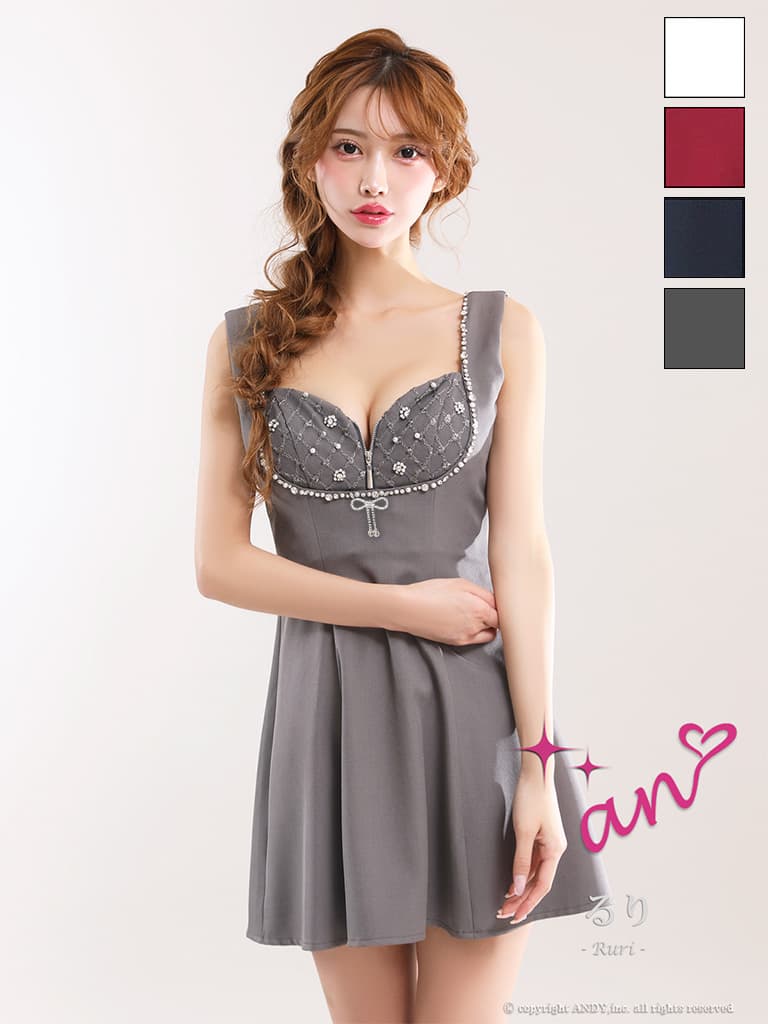 XSサイズあり【an/アン】リボンブローチ付き/ ビジュー/ ノースリーブ/ バストジップ/ レース/ ダイヤ柄/ ストレッチ/ フレア/ ミニドレス/ キャバドレス[OF05] [AOC4070-GY-2602]